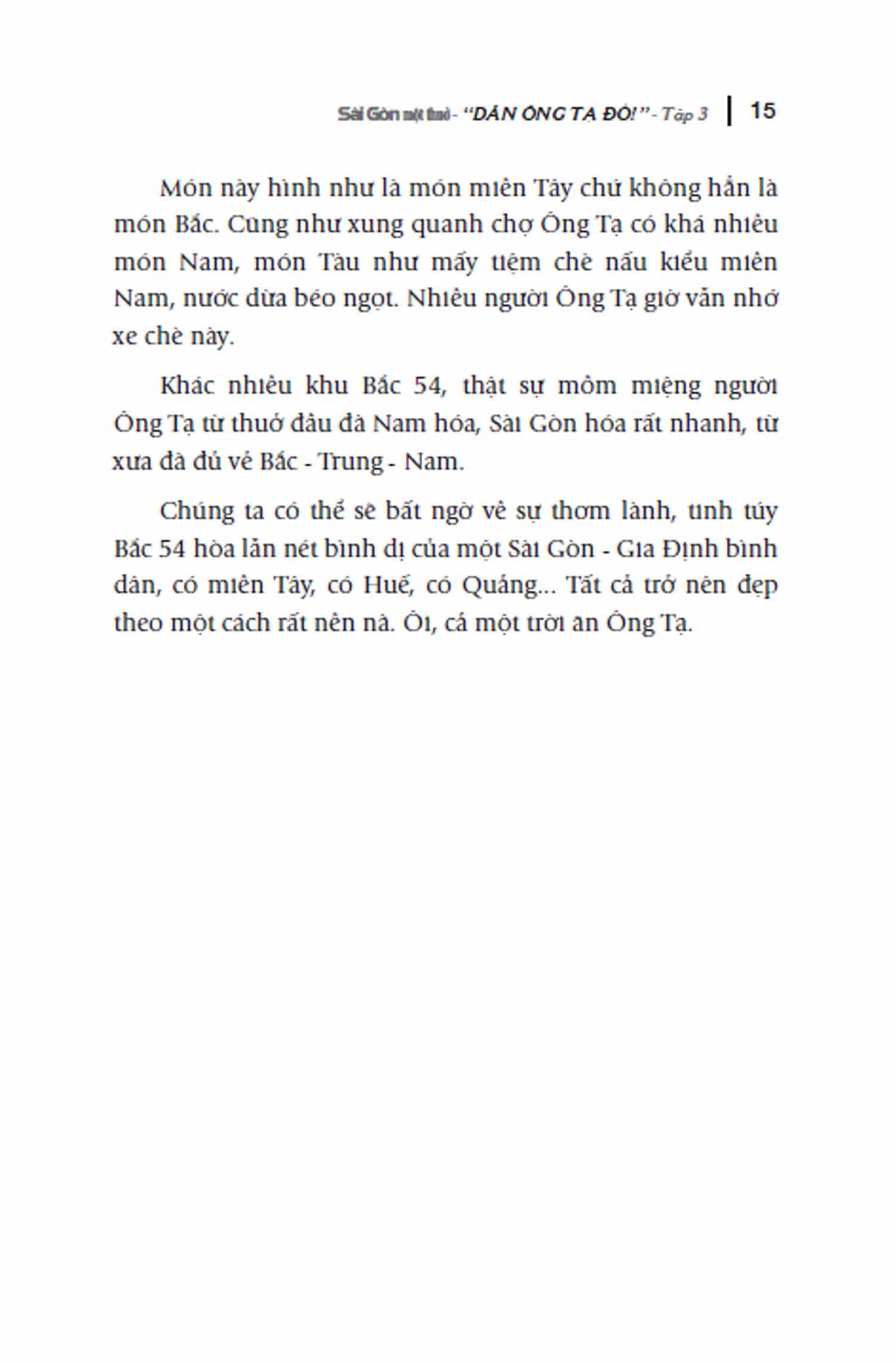Khi đọc Sài Gòn một thuở: “Dân Ông Tạ đó!” tập 3, chúng ta cũng sẽ có cảm nhận tương tự. Tuy nhiên, lần này tác giả đã giới thiệu Ông Tạ theo một cách khác. Không phải bằng bản đồ, công trình kiến trúc, hay những con đường… mà bằng những thứ vô hình như mùi vị, cảm giác… Cù Mai Công đã khéo léo đưa chúng ta bước vào một thế giới khác, để chạm tới phần “hồn cốt” của cộng đồng những người Bắc 54, đặc biệt là cư dân vùng Ông Tạ.