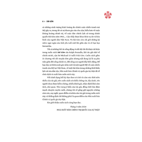 Để bạn đọc có thêm một góc nhìn mới từ một người Mỹ về cuộc chiến tranh của Mỹ tại Việt Nam, về một Sài Gòn trong những thời khắc lịch sử của dân tộc, Nhà xuất bản Chính trị quốc gia Sự thật đã tổ chức dịch và xuất bản cuốn sách Sài Gòn của Ralph Pezzullo.