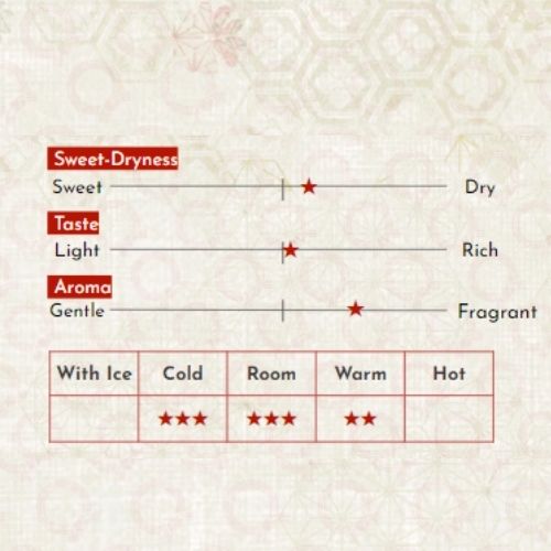 Được ủ trong thùng gỗ tuyết tùng ngay trước khi đóng chai, loại rượu Sake Taru ("thùng") này bùng nổ với hương vị nồng nàn và đặc sắc. Có vị cay và hương thơm thảo