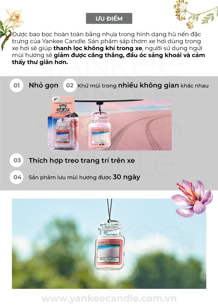 Sáp làm thơm không gian nội thất ô tô một cách nhanh chóng, khiến tinh thần sảng khoái hơn và tránh say xe. Các nguyên liệu chiết xuất hoàn toàn từ thiên nhiên, được nhập