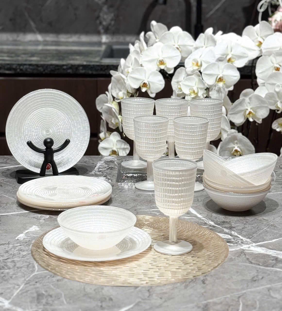 • 6 ly thủy tinh – Dung tích 295ml • 6 bát cơm – Đường kính 15cm • 6 đĩa lót bát – Đường kính 21cm ĐIỂM NỔI BẬT KHÔNG THỂ BỎ QUA: Sắc màu