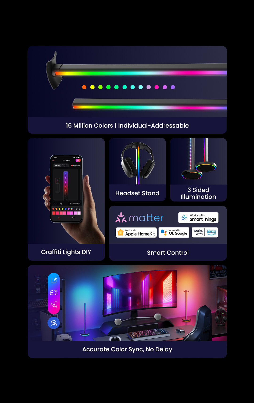Mua tại TiktokGấp đôi ánh sáng RGB cho khả năng đồng bộ không gian 3D ấn tượng Đa năng hơn với giá đỡ tai nghe có thể tháo rời/ gắn liền Hiệu ứng ánh sáng có thể tuỳ chỉnh theo sở thích riêng của bạn Đồng bộ & Tỏa sáng: Âm nhạc, Màn hình, Màu sắc Đồng bộ hoá với màn hình 1 cách dễ dàng mà không cần đến camera/ phụ kiện hỗ trợ khác Mic và phần mềm thu âm tích hợp sẵn khiến bầu không khí sống động hơn Khả năng tương thích mượt mà với tất cả các nền tảng Smarthome lớn Điều khiển thông minh dễ dàng thông qua Matter Hỗ trợ Apple Home, Google Home, Alexa, SmartThings và hơn thế nữa!