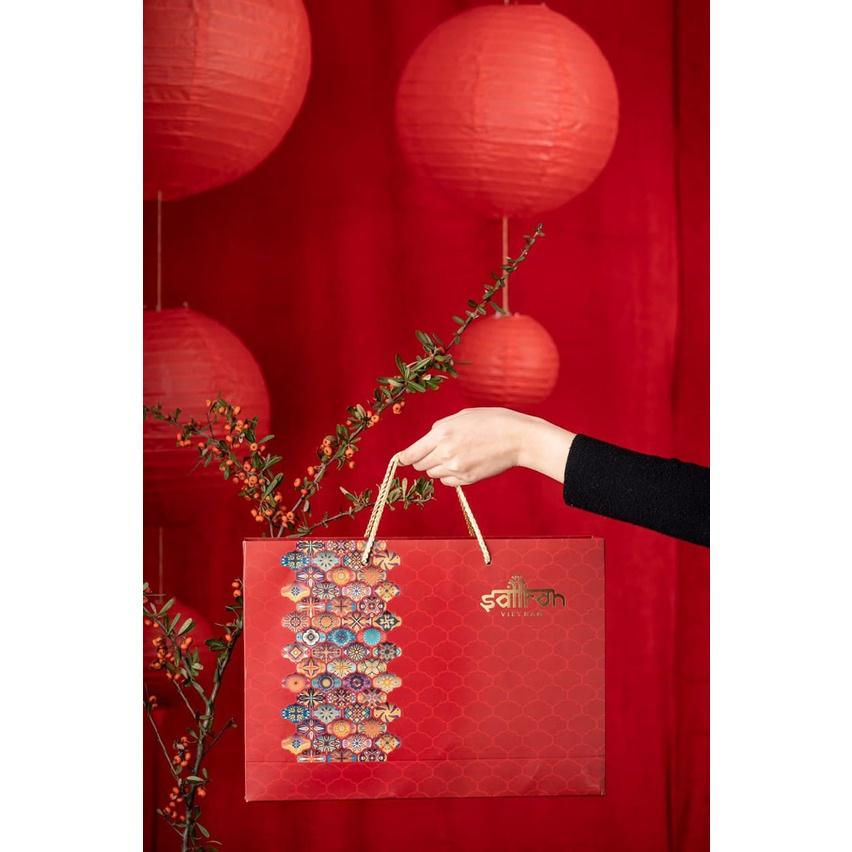 Với bộ hộp & túi được đặt thiết kế riêng cho dịp lễ Tết, mang đậm phong cách Ba Tư sang trọng với họa tiết tinh xảo, in vân dập nổi, phủ màu lỳ tinh tế. Bên trong là Saffron, thảo dược nổi tiếng đắt đỏ, quý hiếm và giá trị cho sức khỏe; được mệnh danh là “vàng đỏ” Trung Đông, kết hợp cùng 2 hũ Trà hoa sấy lạnh thượng hạng và bình nước thủy tinh Saffron Tea.