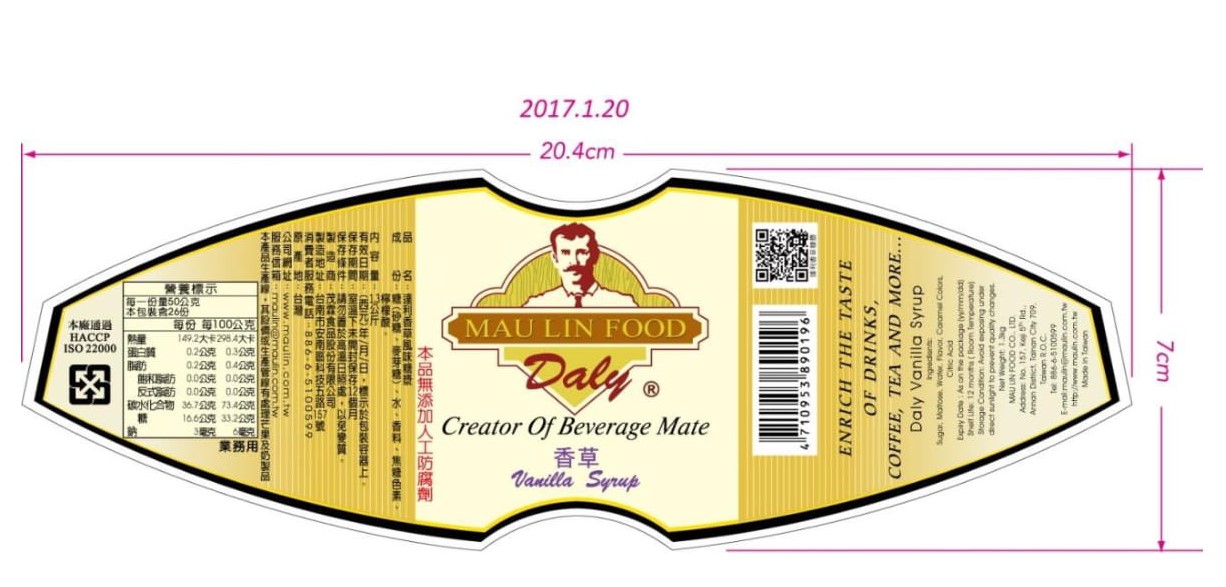 Nhà sản xuất: MAU LIN FOOD CO., LTD (Maulin là một thương hiệu công ty thực phẩm của Đài Loan. Nơi đây vốn được coi là quê hương của trà sữa. Ngày nay, Maulin đã trở thành một thương hiệu nổi tiếng về thực phẩm và đồ uống. Các sản phẩm của công ty gồm có hạt cafe, các loại bột điều vị, hạt thủy tinh dùng và đặc biệt về siro cho trà sữa. Sản phẩm của công ty đạt được chứng nhận ISO22000, HACCP, HALAL. Đây đều là các tiêu chuẩn khắt khe về quản lý cũng như VSATTP quốc tế. Thị trường phân phối sản phẩm chính của công ty là Đài Loan, Trung Quốc và khu vực Đông Nam Á. Hơn nữa, sản phẩm của Maulin cũng đang được kinh doanh tại các thị trường như Mỹ, Đức, Anh, Úc… hay Nhật Bản, Hàn Quốc)
