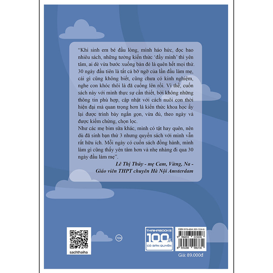 Với những gì đã trải qua, tác giả muốn sẻ chia với mẹ những điều này. Để 30 ngày đầu làm mẹ chỉ có bình yên, để chúng mình thật tự tin vì trong tay đã có sẵn những kiến thức cơ bản và khoa học nhất, và mong sao mẹ sẽ không bao giờ cảm thấy đơn độc khi chăm sóc em bé của mình.