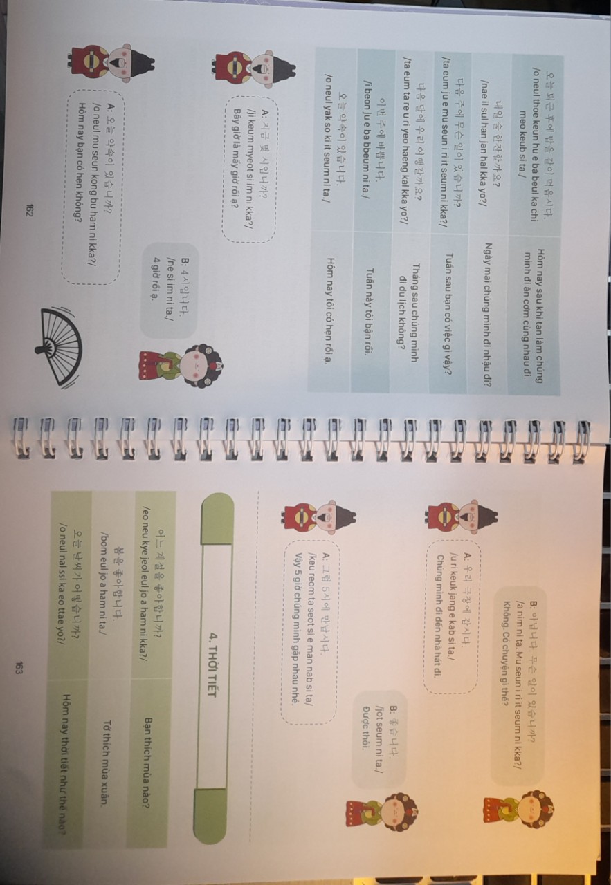 Phần 4: Mẫu câu thông dụng theo chủ đề. Ngoài ra trong cuốn sách này các tác giả đã thêm phần phiên âm, phần tiếng Việt và kèm file ghi âm giúp người học dễ dàng hơn trong việc tự học tiếng Hàn.. Tự học tiếng Hàn giúp bạn không bị gò bó bởi thời gian, giúp bạn thoải mái hơn nhưng nó cũng có thể khiến bạn dễ dàng bỏ cuộc. Vì vậy, tác giả cuốn sách này với mục đích tạo động lực cho các bạn và giúp các bạn không bị lúng túng khi học tiếng Hàn.