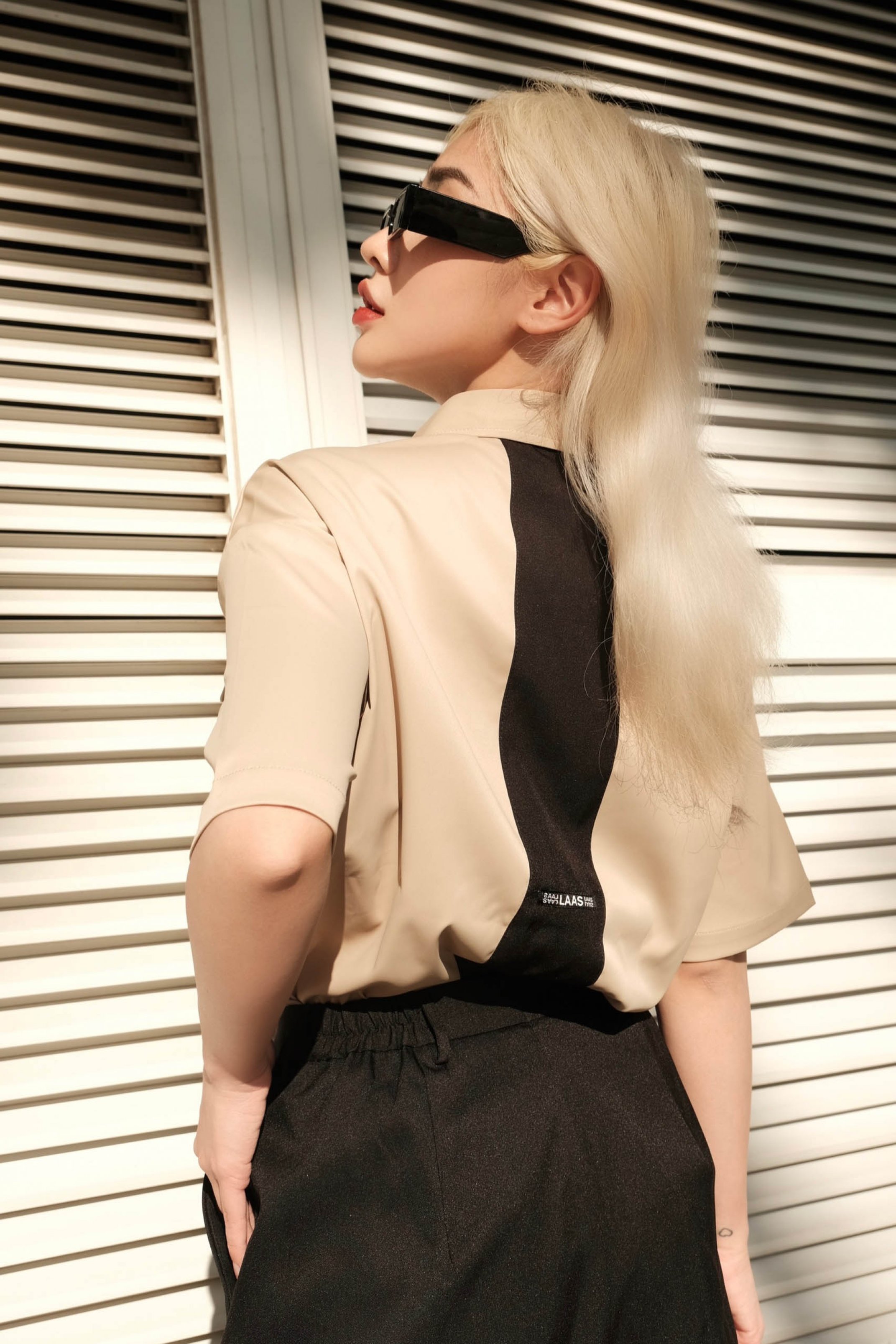 ĐIỂM PHẤN PHẦN PHỐI KẺ SỌC GIỮA TRƯỚC NẸP ÁO, VÀ GIỮA SAU THÂN ÁO PHÍA SAU PHẦN PHỐI SỌC CÓ GẮN TAG LOGO LAAS