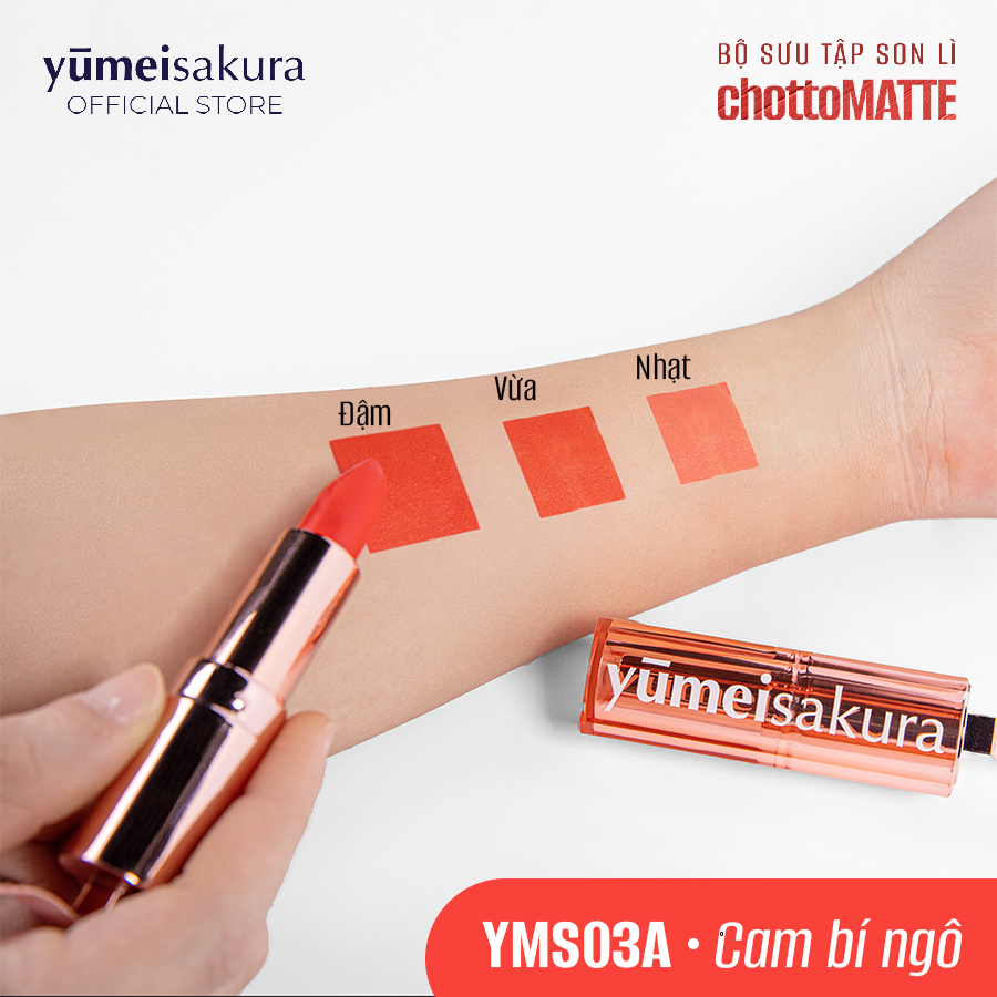 - Dùng thay thế phấn má hồng và phấn mắt cho lớp makeup hài hòa và tiết kiệm thời gian trang điểm. Với gò má, chấm son lên vùng xương gò má, sau đó tán đều xếch lên hai mang tai. Với mắt, dùng đầu son để nhấn vào giữa mắt rồi dùng tay để tán đều ra 2 bên GIỚI THIỆU VỀ BST VỀ BST SON LÌ CHOTTO MATTE Trong tiếng Nhật, Chotto Matte có nghĩa “chờ một chút”, trong đó, chotto là một chút và matte là chờ. Chotto Matte - Chờ một chút là câu cửa miệng mà chắc hẳn bất kỳ cô gái nào cũng đã vài lần thốt lên như thế. Chờ một chút dặm lại miếng son, thoa thêm chút phấn, tất cả cũng là vì để xuất hiện thật xinh đẹp trước thế giới đang chờ ngoài kia. Yêu nhiều hơn! Vui nhiều hơn! Xinh nhiều hơn! Với một chút son đến từ bộ sưu tập Chotto Matte của nhà Yumeisakura. BẢNG MÀU VỚI 05 MÀU SON THỜI THƯỢNG: YMS03A - Pumpkin Orange - Cam Bí Ngô: Bùng nổ năng lượng sôi nổi tích cực YMS07 - Candy Apple - Đỏ Cam: Thỏa đam mê nổi bật YMS15 - Love Me Tonys Pink - Hồng Đất: Dịu dàng, nữ tính và ngọt ngào YMS16 - Bronze Orange - Cam Nâu Đất: Tôn vinh nét phóng khoáng, cá tính độc bản YMS17 - Burgundy Red - Đỏ Rượu Sẫm: Quyến rũ, sang trọng và quyền lực THIẾT KẾ MỚI ĐỘC ĐÁO VÀ ẤN TƯỢNG Thiết kế lấy cảm hứng từ những viên tinh thể trong suốt, sắc hồng rose gold thời thượng tạo nên vẻ ngoài sang trọng độc đáo nhưng cũng không kém phần tiện dụng khi có thêm chi tiết khóa treo son giúp dễ dàng mang theo bên người. CÁCH BẢO QUẢN