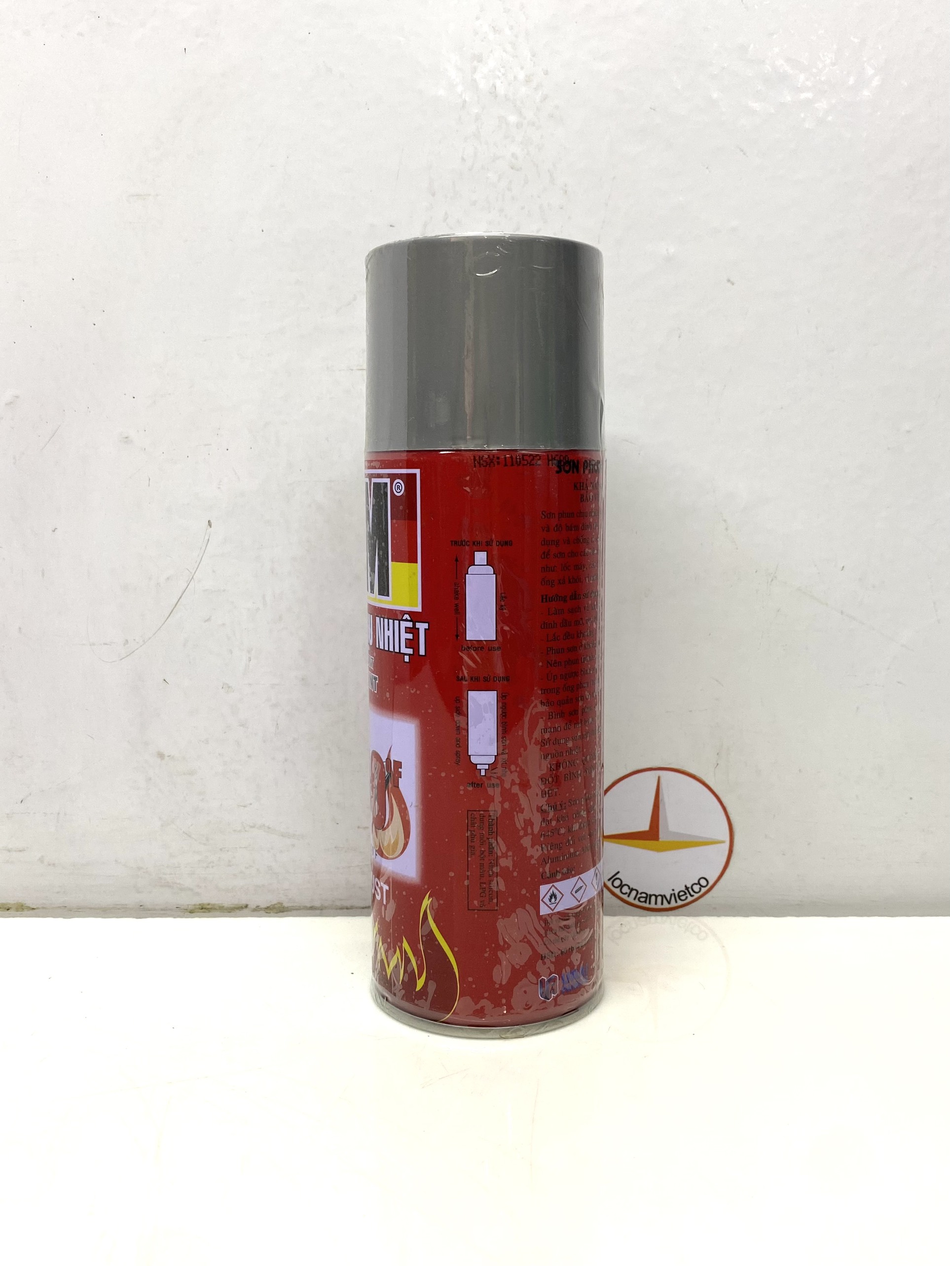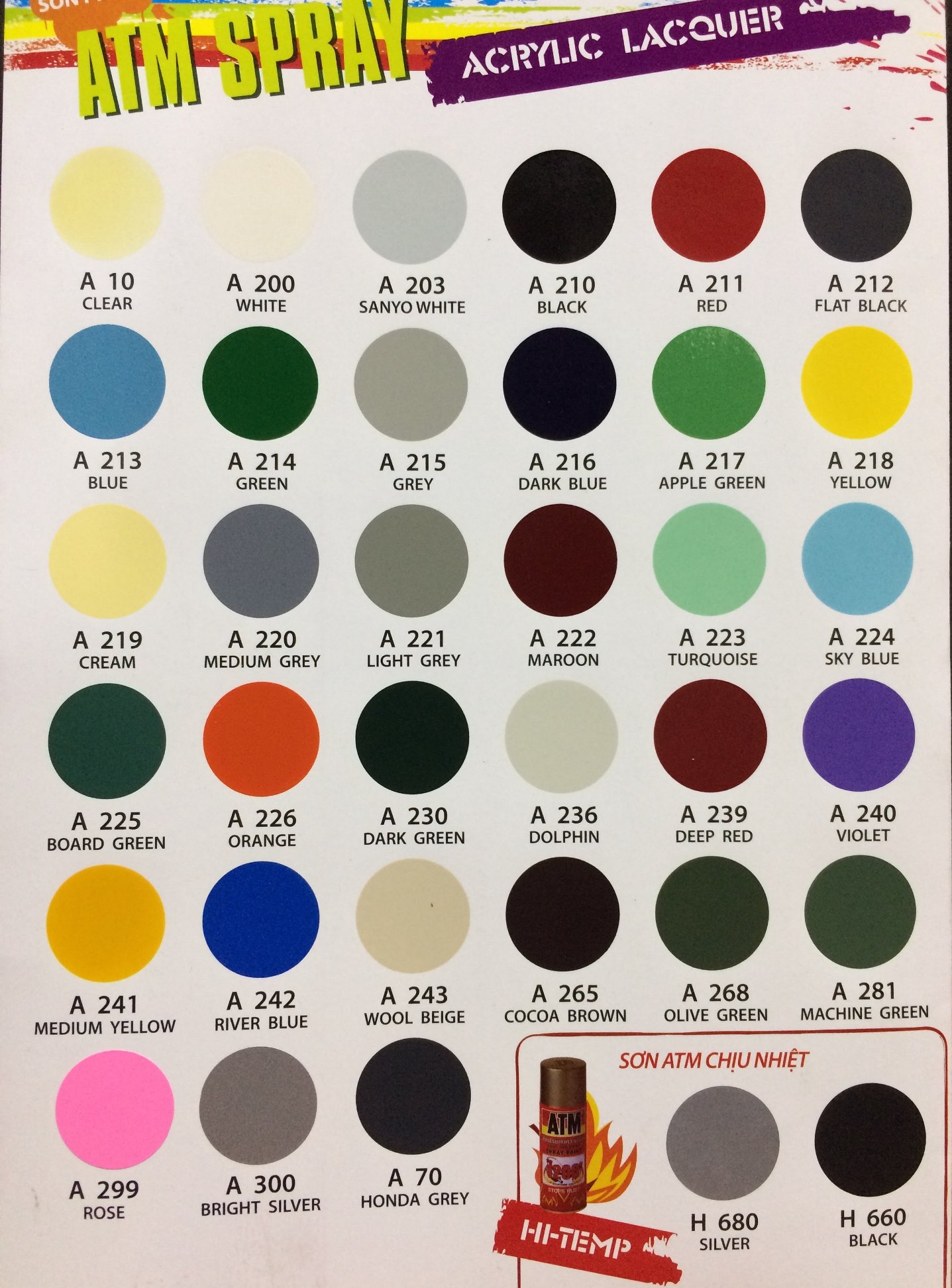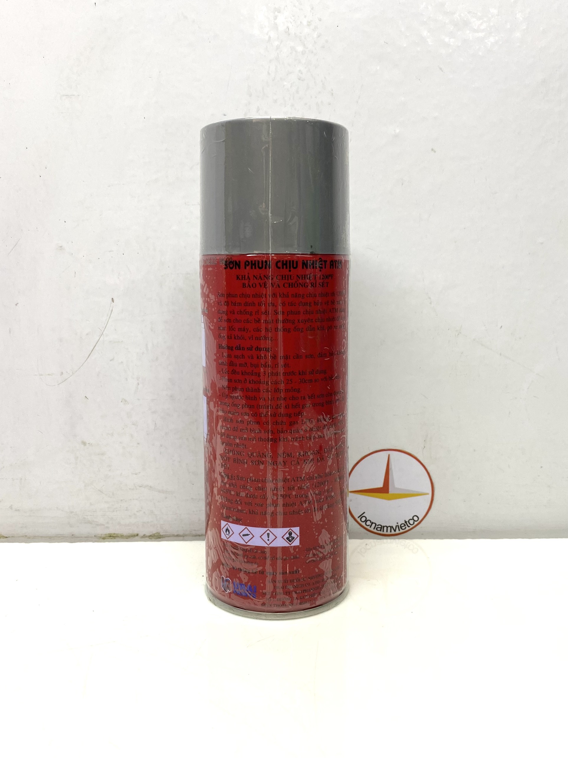 • KHÔNG QUĂNG, NÉM, KHOAN, ĐẬP HOẶC ĐỐT BÌNH SƠN NGAY CẢ KHI SỬ DỤNG HẾT. Chú ý: Sơn phun chịu nhiệt ATM chỉ khô hoàn toàn và đạt khả năng chịu nhiệt tốt nhất (12000F - khoảng 6450C) khi được sấy ở 2500C trong vòng 1 giờ. Riêng đối với sơn phun chịu nhiệt ATM màu H680 - Aluminium, khả năng chịu nhiệt tối đa khoảng 5000C. Thành phần: Nhựa silicon, dung môi, bột màu, LPG và một số thành phần khác. HSD: 60 tháng kể từ ngày sản xuất.