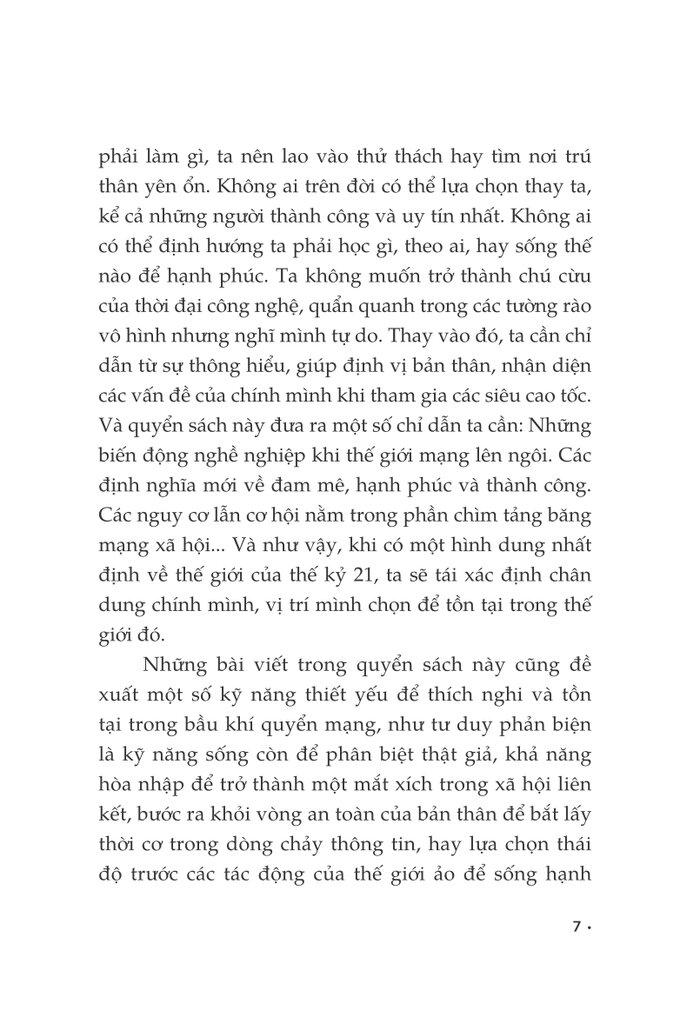 “Mỗi người chúng ta dù ở thời đại nào, suy cho cùng, vẫn có nhu cầu căn bản nhất: Được thấu hiểu và yêu thương. Để được như thế, chúng ta chỉ có một cách là dành thời giờ bên nhau, lắng nghe nhau. So với thời chưa có Internet, chúng ta đối diện ít hơn hay nhiều hơn các vấn đề? Chúng ta có hạnh phúc hơn không?Mọi ứng cứu đến từ bên ngoài đều vô nghĩa nếu không đi cùng sự biến chuyển bên trong của mỗi cá nhân. Sống ảo, ảo bao nhiêu cho vừa? là một cuốn sách để chúng ta cùng đọc, cùng suy nghĩ và cùng trả lời những câu hỏi của ngày hôm nay.”