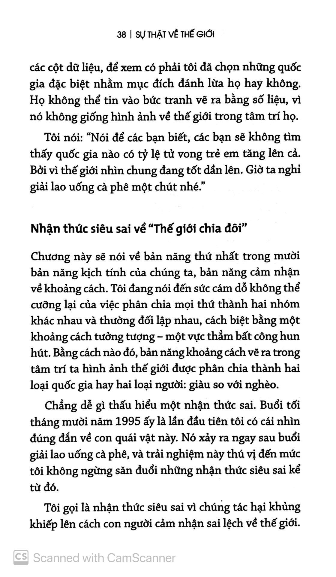 Hóa ra là cõi nhân gian cho dù không hề hoàn hảo nhưng vẫn tốt đẹp hơn nhiều so với những gì ta tưởng. Điều đó không có nghĩa là chẳng còn gì phải lo. Nhưng nếu lúc nào cũng rầu rĩ về mọi việc thay vì đón nhận một thế giới quan dựa vào dữ liệu thực tế, ta sẽ đánh mất khả năng tập trung vào những mối đe dọa thật sự.
