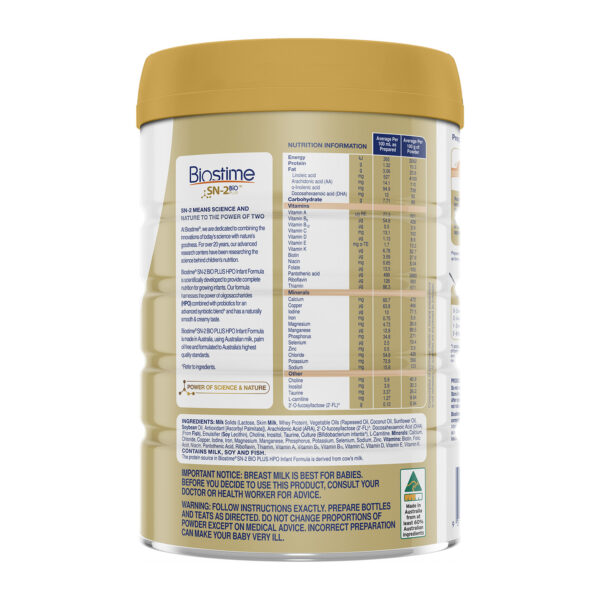 - Giúp trẻ dễ tiêu hóa và hấp thu dinh dưỡng tốt hơn, tăng cân đều. THÀNH PHẦN Chất rắn trong sữa (Lactose, Sữa gầy, Protein Whey), Dầu thực vật (Dầu hạt cải, Dầu dừa, Dầu hướng dương, Dầu đậu nành, Chất chống oxy hóa [Ascorbyl Palmitate]), Axit Arachidonic (ARA), 2′-O-fucosyllactose (2′- FL) ^, Docosahexaenoic Acid (DHA) (Từ Cá), Choline, Inositol, Taurine, Văn hóa (Bifidobacterium Infantis ^), L-Carnitine, Chất nhũ hóa (Lecithin đậu nành) Khoáng chất: Canxi, Clorua, Đồng, Iốt, Sắt, Magie, Mangan, Phốt pho, Kali, Selen, Natri, Kẽm. Vitamin: Biotin, Axit folic, Niacin, Axit Pantothenic, Riboflavin, Thiamin, Vitamin A, Vitamin B6, Vitamin B12, Vitamin C, Vitamin D, Vitamin E, Vitamin K CHỨA SỮA, CÁ VÀ CÁC SẢN PHẨM ĐẬU NÀNH Nguồn protein trong Biostime SN-2 BIO PLUS HPO Infant Formula có nguồn gốc từ sữa bò.
