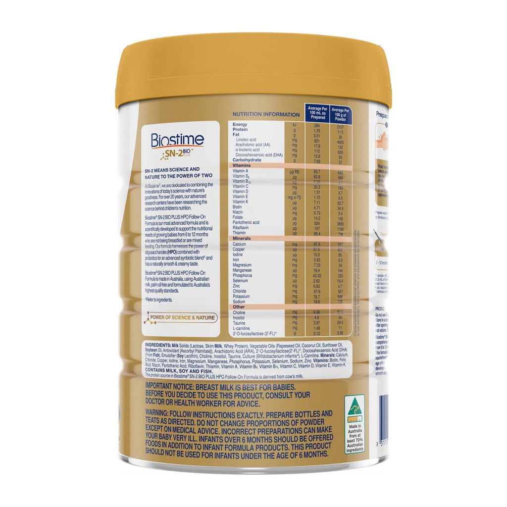 - Giúp trẻ dễ tiêu hóa và hấp thu dinh dưỡng tốt hơn, tăng cân đều. THÀNH PHẦN Milk Solids (Lactose, Skim Milk, Whey Protein), Vegetable Oils (Rapeseed Oil, Coconut Oil, Sunflower Oil, Soybean Oil, Antioxidant [Ascorbyl Palmitate]), Arachidonic Acid (ARA), 2′-O-fucosyllactose (2′-FL), Docosahexaenoic Acid (DHA) (From Fish), Choline, Inositol, Taurine, Culture (Bifidobacterium infantis), L-Carnitine, Emulsifier (Soy Lecithin) Khoáng chất: Calcium, Chloride, Copper, Iodine, Iron, Magnesium, Manganese, Phosphorus, Potassium, Selenium, Sodium, Zinc Các loại Vitamin: Biotin, Folic Acid, Niacin, Pantothenic Acid, Riboflavin, Thiamin, Vitamin A, Vitamin B6, Vitamin B12, Vitamin C, Vitamin D, Vitamin E, Vitamin K CHỨA SỮA, CÁ VÀ CÁC SẢN PHẨM ĐẬU NÀNH Nguồn protein trong Biostime SN-2 BIO PLUS HPO Follow-On Formula có nguồn gốc từ sữa bò.