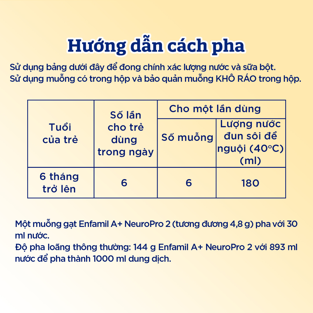 - Độ pha loãng thông thường: 144 g Enfamil A+ NeuroPro 2 với 2’-FL HMO với 893 ml nước để pha thành 1000 ml dung dịch. Không sử dụng lò vi sóng để hâm nóng sản phẩm vì có thể gây bỏng nghiêm trọng. Không tuân thủ đúng các hướng dẫn này có thể gây hại nghiêm trọng. Sau khi được pha, sản phẩm có thể bị hỏng nhanh chóng. Kể cả khi dùng ngay hoặc đậy kín và bảo quản lạnh ở 2-40°C cũng không thể giữ lâu hơn 24 giờ. Không sử dụng sản phẩm đã pha mà không được bảo quản lạnh sau 2 giờ. Không được đông lạnh sản phẩm đã pha. Nên cho trẻ sử dụng hết trong vòng 1 giờ hoặc bỏ đi. HƯỚNG DẪN BẢO QUẢN