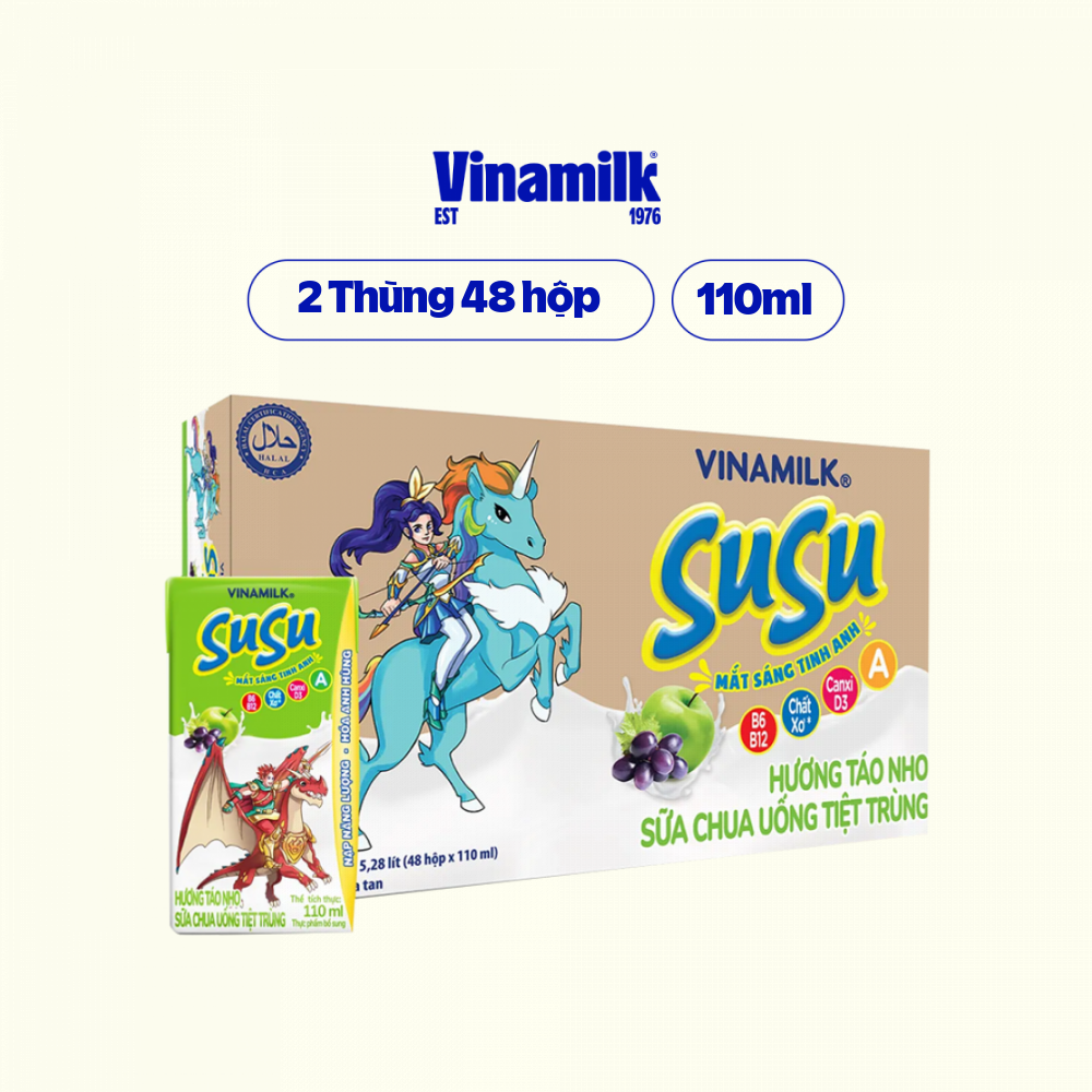 - Bao bì "thần thú" cực vui nhộn. Sữa chua uống SuSu với vị ngọt béo, chua chua thơm ngon tuyệt vời, bổ sung vitamin A giúp bé mắt sáng tinh anh, chất xơ hòa tan (Prebiotic) hỗ trợ hệ tiêu hóa để bé luôn khỏe mạnh và năng động mỗi ngày. Thùng 48 hộp sữa chua uống hương táo nho SuSu 110ml hương táo nho thơm ngon đóng thùng lớn tiết kiệm