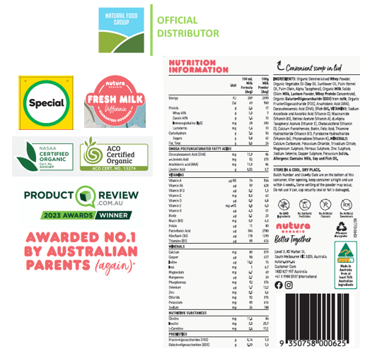 1. Thành phần: Bột whey khử khoáng hữu cơ, dầu thực vật hữu cơ (dầu đậu nành, dầu hướng dương, dầu hạt cọ, dầu cọ, alpha tocopherol), sữa đặc hữu cơ (sữa tách béo, bột lactose, đạm whey cô đặc), Galacto-Oligosaccharide (GOS) hữu cơ từ sữa, Fructo-oligosaccharide (FOS) hữu cơ, acid arachidonic (ARA), acid docosahexaenoic (DHA), (dầu cá). Các vitamin: natri ascorbat và acid ascorbic (vitamin C), niacin (vitamin B3), retinyl acetat (vitamin A), DL-alpha tocopheryl acetat (Vitamin E), cholecalciferol (Vitamin D), calci pantothenat, d-biotin, acid folic, thiamin hydroclorid (Vitamin B1), pyridoxin hydroclorid (Vitamin B6), phytomenadion (Vitamin K). Các khoáng chất: calci carbonat, kali clorid, natri citrat, magnesi sulphat, sắt sulphat, kẽm sulfat, natri selenit, đồng sulfat, kali iodid.