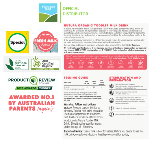 Sữa công thức Hữu cơ Nutura Organic số 3 1. Thành phần: Sữa đặc tách béo hữu cơ, sữa đặc hữu cơ, Maltodextrin hữu cơ, dầu đậu nành hữu cơ, bột lactose hữu cơ, bột whey khử khoáng hữu cơ, Galacto-Oligosaccharide (GOS) hữu cơ từ sữa, Fructo-oligosaccharide hữu cơ, acid arachidonic (ARA), acid docosahexaenoic (DHA), (dầu cá). Các vitamin: Acid ascorbic (vitamin C), niacin (vitamin B3), D-alpha tocopheryl acetat (Vitamin E), cholecalciferol (Vitamin D), retinyl acetat (vitamin A), acid folic, pyridoxin hydroclorid (Vitamin B6), thiamin hydroclorid (Vitamin B1). Các khoáng chất: calci phosphat, kali clorid, magnesi sulphat, natri citrat, sắt sulphat, kẽm sulfat, kali iodid. 2. Khối lượng tịnh: 800 g. 3. Thời hạn sử dụng: 02 năm kể từ ngày sản xuất, xem ngày sản xuất và hạn sử dụng in dưới đáy hộp. 4. Bảo quản: Sau khi mở, đóng nắp hộp kín và sử dụng trong vòng 4 tuần. Bột sữa có thể bị lắng. Không sử dụng nếu hộp, niêm phong an toàn trên nắp hoặc giấy bạc bị hỏng. 5. Đối tượng sử dụng: Trẻ 12 – 36 tháng tuổi. 6. Xuất xứ : Úc