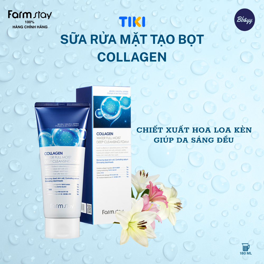 SỮA RỬA MẶT TẠO BỌT COLLAGEN _ COLLAGEN WATER FULL MOIST DEEP CLEANSING FOAM THÀNH PHẦN: xem trên bao bì sản phẩm. CÔNG DỤNG:    - Làm sạch nhẹ nhàng lớp trang điểm và các tác động bên ngoài suốt cả ngày với công nghệ ion âm.   - Giúp cân bằng độ pH da, giúp da ẩm mượt, dịu mát sau khi rửa mặt.   - Giúp da tẩy nhẹ TBC và bả nhờn sâu trong lỗ chân lông.   - Tăng cường dưỡng chất chống oxy hóa da và cải thiện nếp nhăn da. HƯỚNG DẪN SỬ DỤNG:    - Làm ướt mặt bằng nước sạch, lấy một lượng nhỏ sữa rửa mặt vào lòng bàn tay và tạo bọt sau đó nhẹ nhàng thoa và massage bọt lên mặt theo chuyển động tròn. Rửa mặt sạch lại bằng nước sạch. LƯU Ý KHI SỬ DỤNG:   - Khi sử dụng sản phẩm hoặc sau khi sử dụng, nếu vùng da sử dụng bị kích ứng hay tác dụng phụ do ánh nắng trực tiếp, hãy ngừng sử dụng và tham khảo ý kiến chuyên gia hoặc bác sĩ chuyên khoa.   - Không sử dụng trên vùng da bị thương và vết thương hở.   - Tránh xa tầm tay trẻ em vật nuôi và tránh ánh nắng trực tiếp lên sản phẩm.   - Sử dụng trong vòng 6 tháng sau khi mở nắp ( mở seal ) và đậy nắp kín sau khi sử dụng.   - Bảo quản sản phẩm ở nhiệt độ thường. Ngày SX & HSD: xem trên bao bì sản phẩm. Dung tích: 180ml. Nhà SX: Farmstay - Hàn Quốc. Nhà NK & PP: Công Ty TNHH BB&YY ( Beauty and Young). SCB: 239809/24/CBMP-QLD.