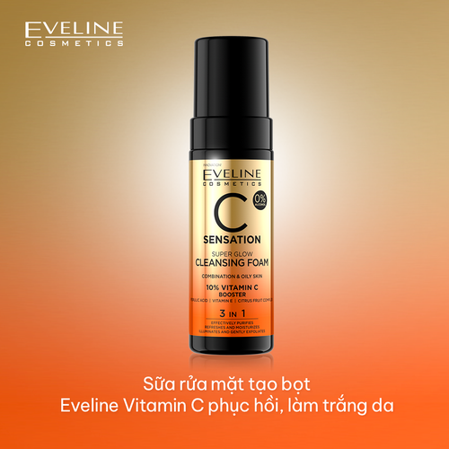 - Chiết xuất trái Yuzu có tác dụng chống oxy hóa và tăng cường dưỡng ẩm, tái tạo và làm sáng da. Sản phẩm giúp làm sạch da và dưỡng trắng hiệu quả Công dụng: Sữa rửa mặt tạo bọt Eveline vitamin C phục hồi, làm trắng da giúp loại bỏ tạp chất, dưỡng ẩm và làm sáng da một cách hoàn hảo, ngăn ngừa khuyết điểm trên da hiệu quả. Hướng dẫn sử dụng: Làm ướt da mặt, lấy lượng vừa đủ ra tay rồi tạo bọt. Tiếp theo thoa lên mặt, massage đều, sau đó rửa lại với nước. Tránh vùng mắt và môi. Bảo quản: Nơi thoáng mát. Tránh tiếp xúc trực tiếp dưới ánh nắng. Mô tả dòng sản phẩm: Dòng sản phẩm Sensation C mang tính cách mạng dựa trên sự kết hợp của vitamin C nồng độ cao, vitamin E và Axit Ferulic mang lại hiệu quả bảo vệ lâu dài gấp ba lần chống lại tác hại của các gốc tự do, đây là 3 chất chống oxy hóa hiệu quả nhất trong da liễu. Giúp cải thiện rõ rệt vẻ ngoài của da và làm chậm quá trình lão hóa. Xuất xứ thương hiệu: Eveline - BaLan HSD: 3 năm kể từ ngày sản xuất, ngày sản xuất in trên sản phẩm
