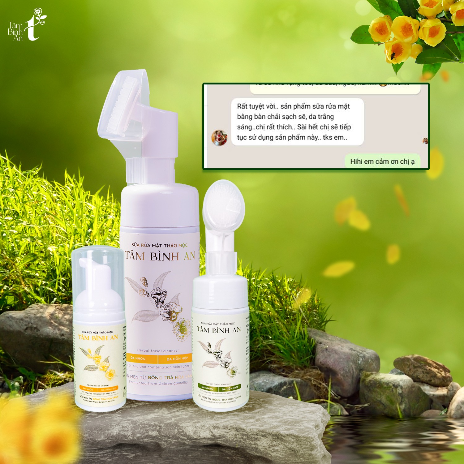 Mô tả: Sữa rửa mặt thảo mộc Tâm Bình An gồm các thành phần chủ yếu từ thiên nhiên, chiết xuất từ Trà Hoa Vàng mang tới các công dụng như làm sạch sâu, làm thông thoáng lỗ chân lông, duy trì độ ẩm tự nhiên cho da, chống oxy hóa vượt trội giúp ngăn ngừa mụn trên da, giúp da luôn tươi sáng và mềm mại. Dung tích: 150ml Ưu điểm: An toàn cho da: Đã được kiểm nghiệm da liễu Không chứa hóa chất độc hại, an toàn cho mọi loại da, kể cả da nhạy cảm. Làm sạch cho da hiệu quả: Loại bỏ bụi bẩn, bã nhờn và tế bào chết trên da giúp da thông thoáng và khỏe mạnh. Kích thích sản sinh collagen, giúp da săn chắc, trẻ trung và đàn hồi. Cấp ẩm và dưỡng da mềm mại: Nhờ chiết xuất từ Trà Hoa Vàng giàu vitamin, khoáng chất và các hợp chất chống oxy hóa, giúp nuôi dưỡng da từ sâu bên trong. Kiểm soát dầu nhờn: Loại bỏ bã nhờn dư thừa trên da, giúp da thông thoáng, ngăn ngừa mụn trứng cá. Thiết kế đầu rửa tạo bọt silicon giúp matxa da mặt, tạo bọt giúp thẩm thấu cho da tốt hơn, tiện lợi, dễ dàng tháo rời vệ sinh. Thành phần: Purified Water, Camellia Chrysantha (Trà Hoa Vàng), Perilla Frutescens Leaf Extract (Chiết xuất Lá Tía Tô), Lactuca indica Root Extract (Chiết xuất Rễ Bồ Công Anh), Saccharomyces/Rice Bran Ferment (Nguyên liệu lên men từ mầm cám Gạo), Ananas Sativus (Pineapple) Fruit Extract (Chiết xuất quả Dứa), Aqua (and) Disodium Cocoyl Glutamate (and) Sodium Cocoyl Glutamate, Hydrolyzed Yeast Protein, Glycerin, Tocopheryl Acetate (Vitamin E), PEG-40 Hydrogenated Castor Oil, Phenoxyethanol (and) Ethylhexylglycerin, Allantoin, Fragrance (Santal 33). KHÔNG CHỨA: SILICON, PARABEN, MÀU TỔNG HỢP, CHẤT CẤM, HÓA CHẤT, MÀI MÒN DA, GÂY TÁC DỤNG PHỤ. Công nghệ lên men tự nhiên giữ dưỡng chất mang lại hiệu quả rõ rệt sau 1-2 tuần sử dụng Công dụng: