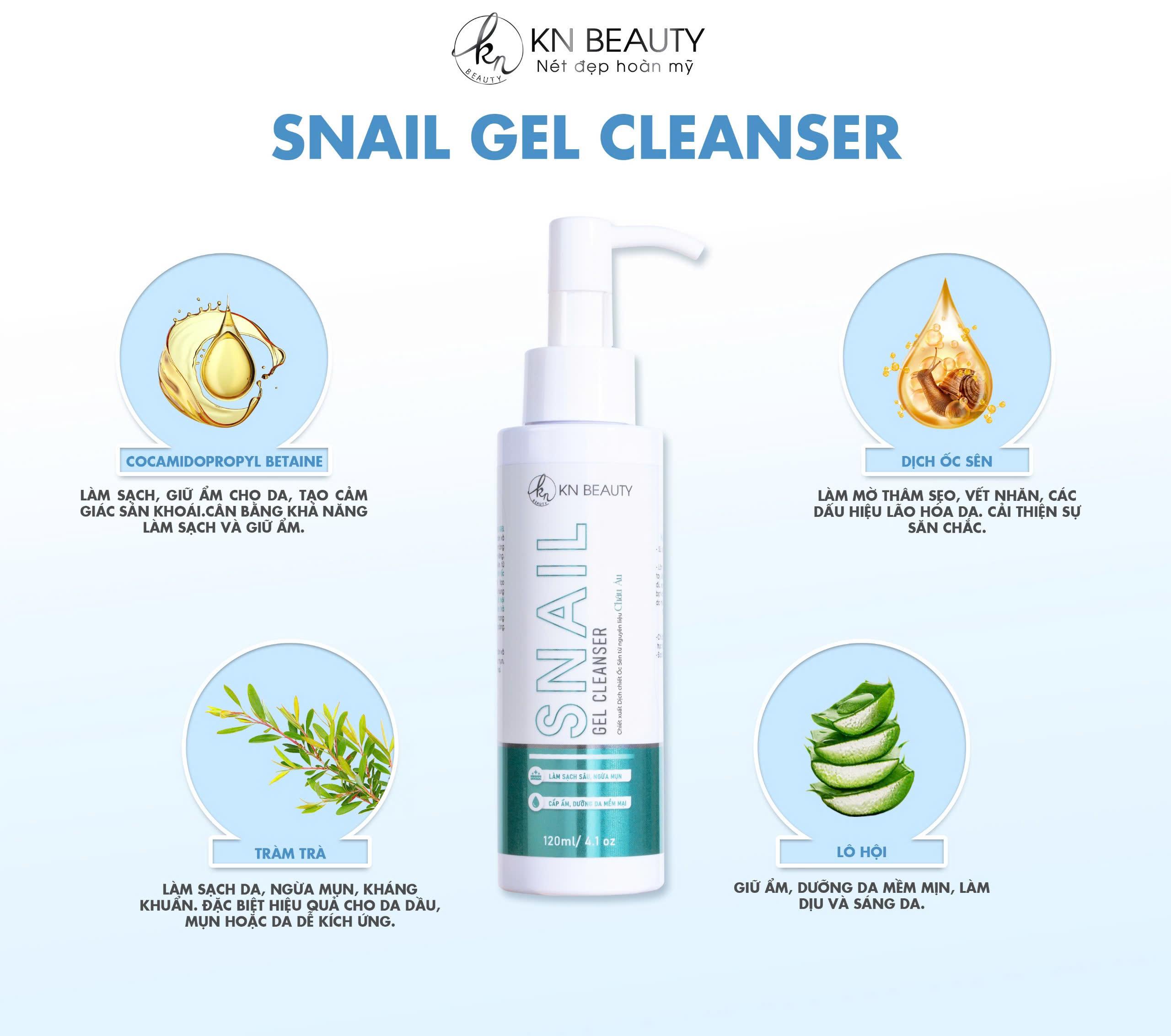Mua tại TiktokGel Rửa Mặt Trắng Da Ngừa Mụn KN Beauty SNAIL GEL CLEANSER 120ml Gel rửa mặt KN Beauty SNAIL GEL CLEANSER giúp làm sạch nhờn và chất bẩn nhờ bọt mịn nhẹ nhàng len lỏi trong từng lỗ chân lông. Nguồn dưỡng chất tự nhiên dịch chiết ốc sên đến từ Châu Âu giúp da trở nên trẻ trung và săn chắc, thành phần lô hội dưỡng ẩm vượt trội và tràm trà ngăn ngừa mụn hiệu quả mang đến làn da mịn màng, trắng sáng. CÔNG DỤNG: Gel rửa mặt Sáng Da Snail Gel Cleaner KN Beauty 120ML là sản phẩm chăm sóc da hiệu quả trong việc làm sạch và cải thiện làn da.