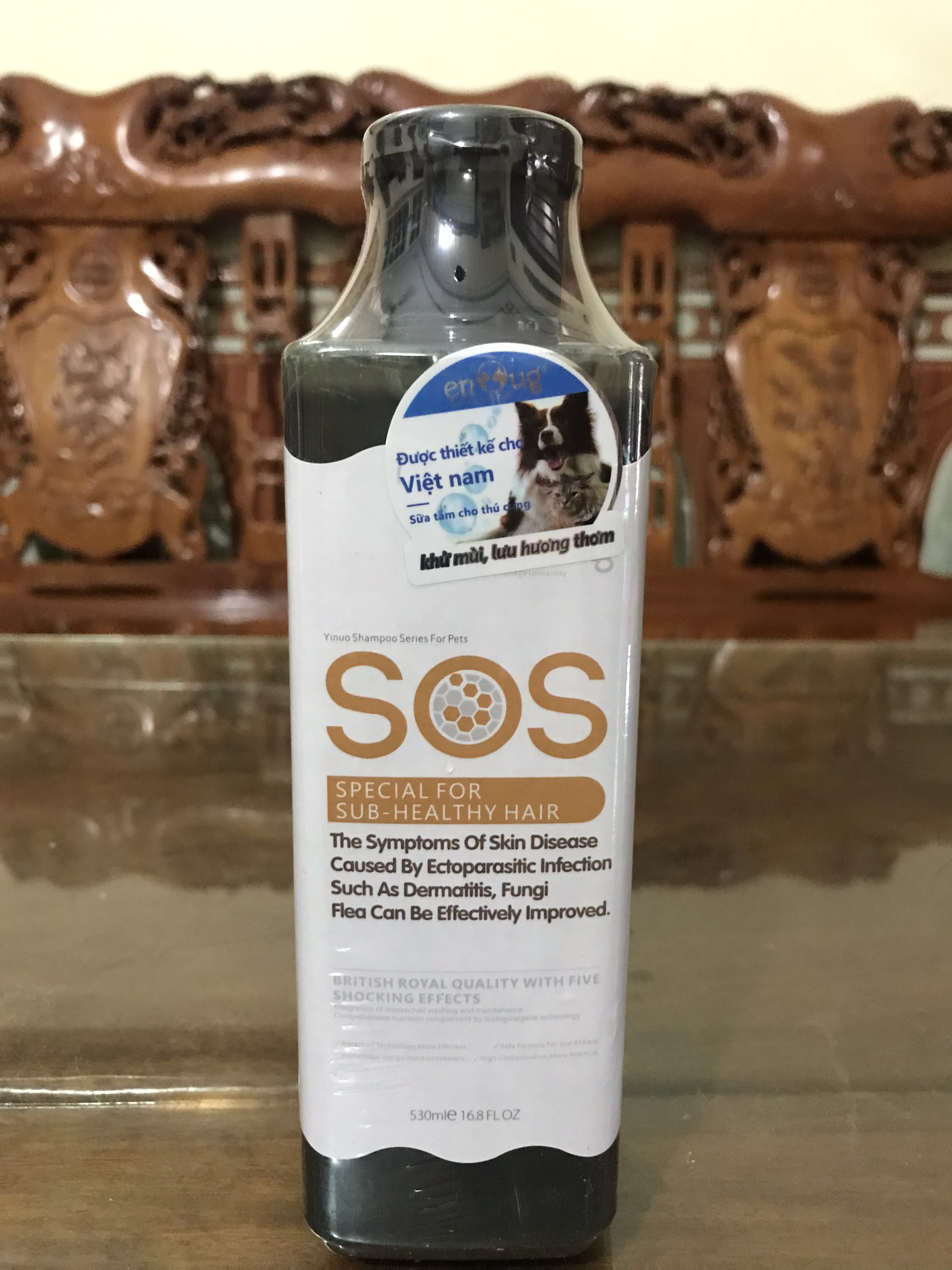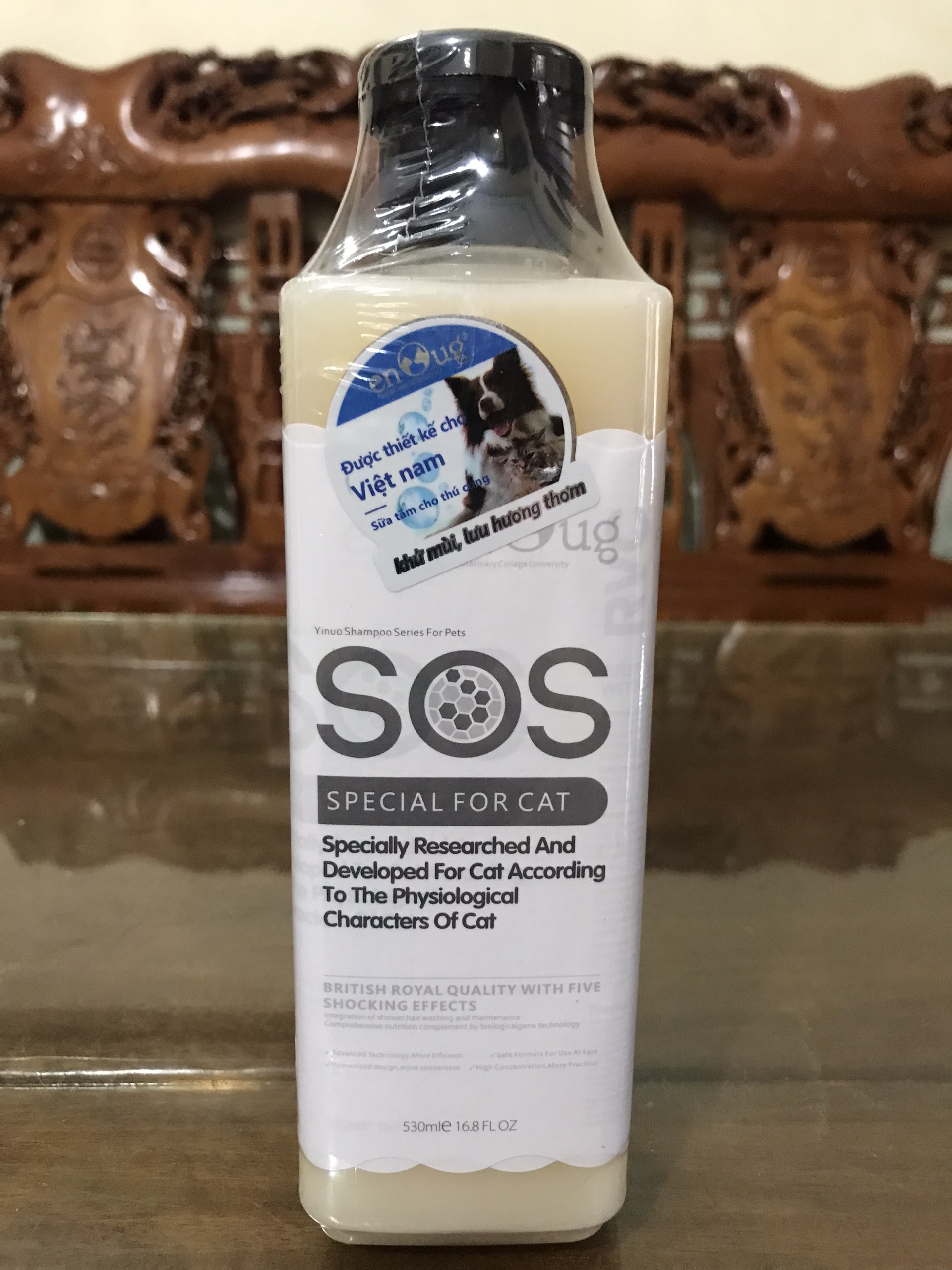 SỮA TẮM CHÓ MÈO SOS 530ml có nhãn được thiết kế cho thị trường Việt Nam - Công dụng của sữa tắm chó mèo SOS: làm sáng màu lông, loại bỏ bụi bẩn, khử mùi,