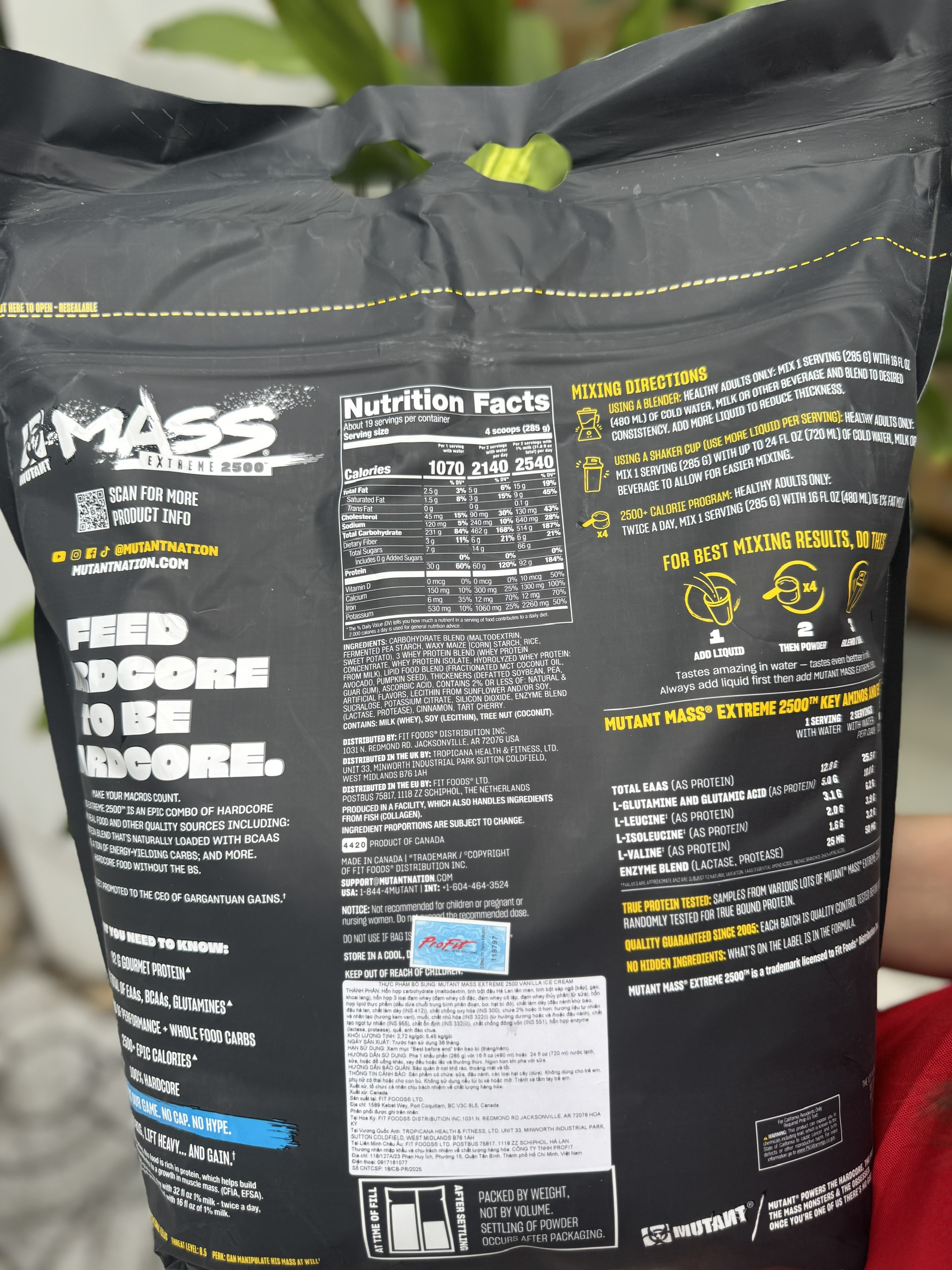 - Đã có giải pháp tối ưu cho bạn, Mass xxxTreme 2500 của Mutant đến từ Canada. Thành phần: Carbohydrate tinh lọc, chất lượng cao, 100% Whey Protein nguyên chất và các Acid Béo thiết yếu (EFAs) MUTANT MASS XXXTREME 2500 12Lbs cung cấp thành phần dinh dưỡng: – 8 muỗng (570g) pha với 940ml sữa: