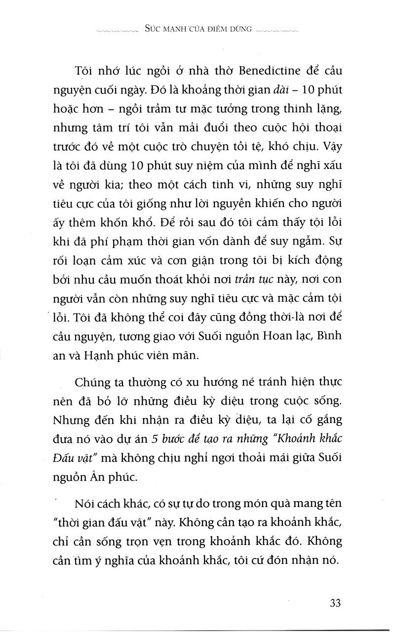 Mua tại TiktokSức Mạnh Của Điểm Dừng (Tái Bản) "Tôi ngồi xuống để đọc quyển sách này. Tôi đã phải đọc nó, và chỉ có ngày cuối tuần để thực hiện việc ấy. Đó là nhiệm vụ trong danh sách những việc cần làm của tôi. Trong vòng 10 phút đọc sách, điều gì đó đã xảy ra. Nhiệm vụ đã trở thành trải nghiệm. Tôi nhận thấy mình đã giảm nhiệt độ lại, cảm nhận được hơi ấm của ngọn lửa từ sưởi, cảm thấy thoải mái khi được cuộn mình trong chiếc chăn bông, lắng nghe tiếng tích tắc của chiếc đồng hồì vậy bạn hãy tự trao cho mình món quà, đó là tìm đọc cuốn sách này." - Kathy Cleveland Bull, người dẫn chương trình radio Fromthe Inside Out -