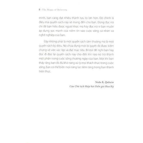 Sức mạnh niềm tin của Claude M. Bristol sẽ mang lại cho bạn đọc sự khích lệ và hỗ trợ mà các bạn đang cần. Nó chỉ ra một cách hết sức đơn giản nhưng đầy thuyết phục rằng phép ám thị luôn luôn có thể được sử dụng để cải thiện hiệu quả của bất kỳ công việc nào. Nó giải phóng mọi tiềm năng và giúp chúng ta tin ở chính mình, đó cũng là một kho bí quyết đầy hiệu quả để phát triển và nuôi dưỡng niềm tin ấy. Chẳng hạn, Bristol kể lại rằng ông thường vẽ nhanh ký hiệu đồng đô-la trên bất cứ mẩu giấy lớn nhỏ nào xuất hiện trên bàn ông. Nghe thật lạ lùng phải không bạn? Vâng, đó không phải là một bài tập luyện trí nhớ, mà là một phương pháp tưởng tượng có tính toán nhằm mục đích gia tăng sức mạnh của niềm tin.