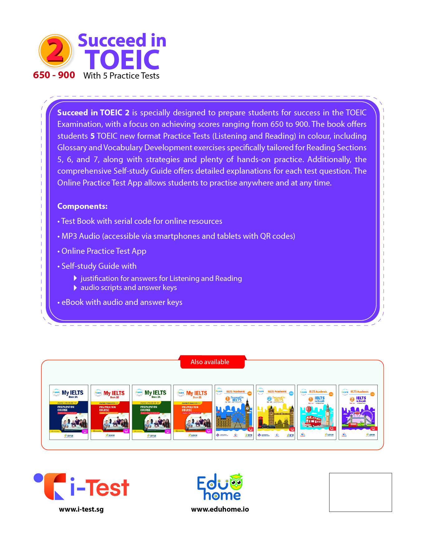 Succeed in TOEIC is specially designed to prepare students for success in the TOEIC Examination, with a focus on achieving scores ranging from 550 to 750 and 650 to 900. The book offers students 6