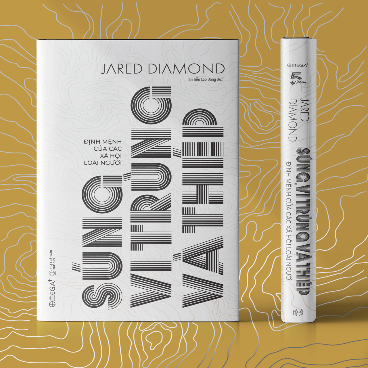 Gáy tròn, bìa cứng bọc vải, nền đen ép nhũ kim chữ “Súng, vi trùng và thép”, dập chìm tinh tế, sang trọng, có in dấu ấn phiên bản Covid Edition, bìa sau in logo bản đặc biệt Omega+.