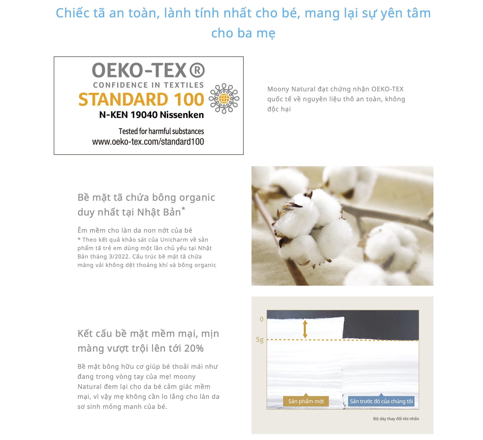 - Dòng tã Moony Natural và tã dán Moony Blue đạt chuẩn Chứng nhận Oeko-tex quốc tề về Nguyên liệu thô an toàn – chống độc hại ( chứng nhận bởi Viện kiểm nghiệm Hohenstein Đức và Institute für Oekologie, Technik und Innovation ÖTI (Wien/Áo)). Mẹ hoàn toàn an tâm khi lựa chọn Moony làm người bạn đồng hành của bé. Đặc điểm nổi bật Công nghệ thân thiện với làn da bé