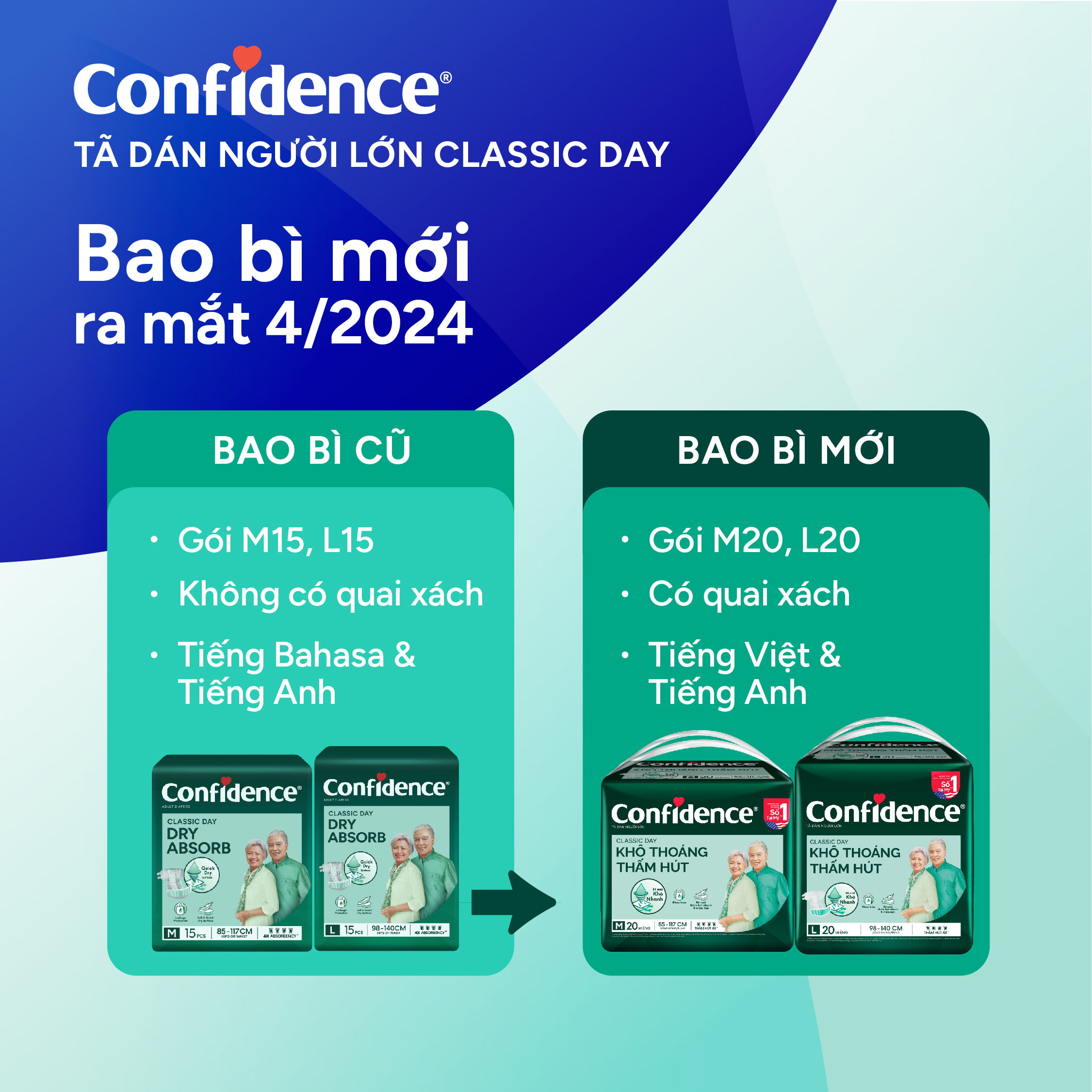 TÃ DÁN CONFIDENCE CLASSIC DAY - SIÊU THOÁNG KHÍ, SIÊU THẤM HÚT - AN TÂM & THOẢI MÁI cho cả gia đình. Sản phẩm tăng cường độ thấm hút và giữ bề mặt tã luôn