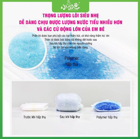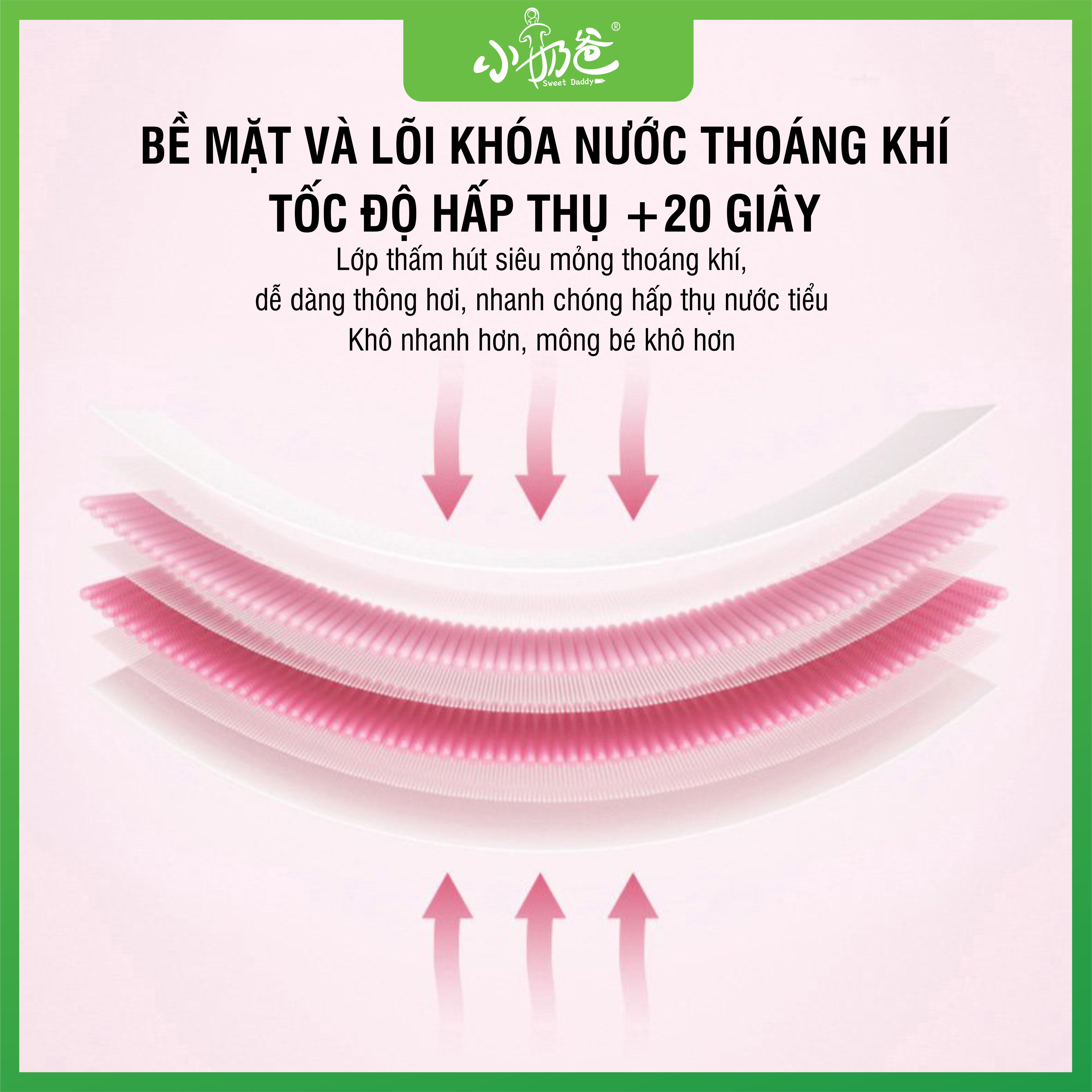 - 8 Thành phần và tính năng nổi bật của SWEET DADDY: 1/ SIÊU THẤM HÚT: Sweet Daddy sử dụng cấu trúc lõi đầy đủ 5 lớp composite với 430g lõi hấp thụ. Lớp trên sử dụng SAN-DIA SAP nhập khẩu của Nhật Bản để khóa nước mạnh mẽ và không bao giờ thẩm thấu ngược. Và lớp dưới sử dụng SUMITOMO SAP hút nước, để hút nước cực nhanh và lan tỏa nước nhanh giữ khô ráo. 2/ SIÊU MỎNG: Thiết kế độc đáo chỉ mỏng dưới 2mm giúp bé thoải mái vận động, không lo chân chữ O. 3/ SIÊU MỀM: Lớp bề mặt ngọc trai 3D lồi lõm với 5000 lỗ thông hơi 3D nano, tăng cường khả năng thông gió, diện tích hấp thụ lớn hơn, hấp thụ chất lỏng nhanh hơn, thiết kế lồi-lõm giúp hấp thụ nước tiểu chính xác hơn, không bị rò rỉ sang một bên, khả năng hấp thụ phân mạnh hơn và dễ khuếch tán hơn. Giữ cho mông trẻ luôn khô ráo, siêu mềm mại, không gây kích ứng, chống đỏ mông cho bé. 4/ SIÊU CẢI TIẾN: Lõi treo công nghệ hình chữ U cải tiến, diện tích hấp thụ mở rộng, tốc độ dẫn dòng được đẩy nhanh, không thấm ngược, không vón cục, tạo lớp liên tục, cho bé cảm giác khô thoáng nhất. 5/ SIÊU CO GIÃN: Thiết kế cải tiến lưng thun siêu co giãn 360 độ, có chun co giãn 2 đầu vừa đủ để không làm hằn rốn tạo cảm giác mềm mại như vòng tay mẹ ôm ấp mang đến cho bé sự nâng niu thân mật nhất 6/ SIÊU BẢO VỆ: Thiết kế 2 lớp chống rò rỉ đàn hồi thông minh 3D, bảo vệ hoàn toàn, không làm bó chân, 100% chống rò rỉ 2 bên. 7/ SIÊU THOÁNG KHÍ: Sử dụng màng đáy mềm và mịn bằng vải lụa nhập khẩu, chứa hàng chục triệu lỗ chân lông siêu thoáng khí, thoát ẩm nhanh chóng giúp da không bị kích ứng. Cap lưng cao giúp chống tràn cho bé khi đi tiểu nhiều. 8/ SIÊU AN TOÀN: Không chất huỳnh quang, formaldehyde, không kích thích, không gây dị ứng. -SWEET DADDY CAM KẾT: