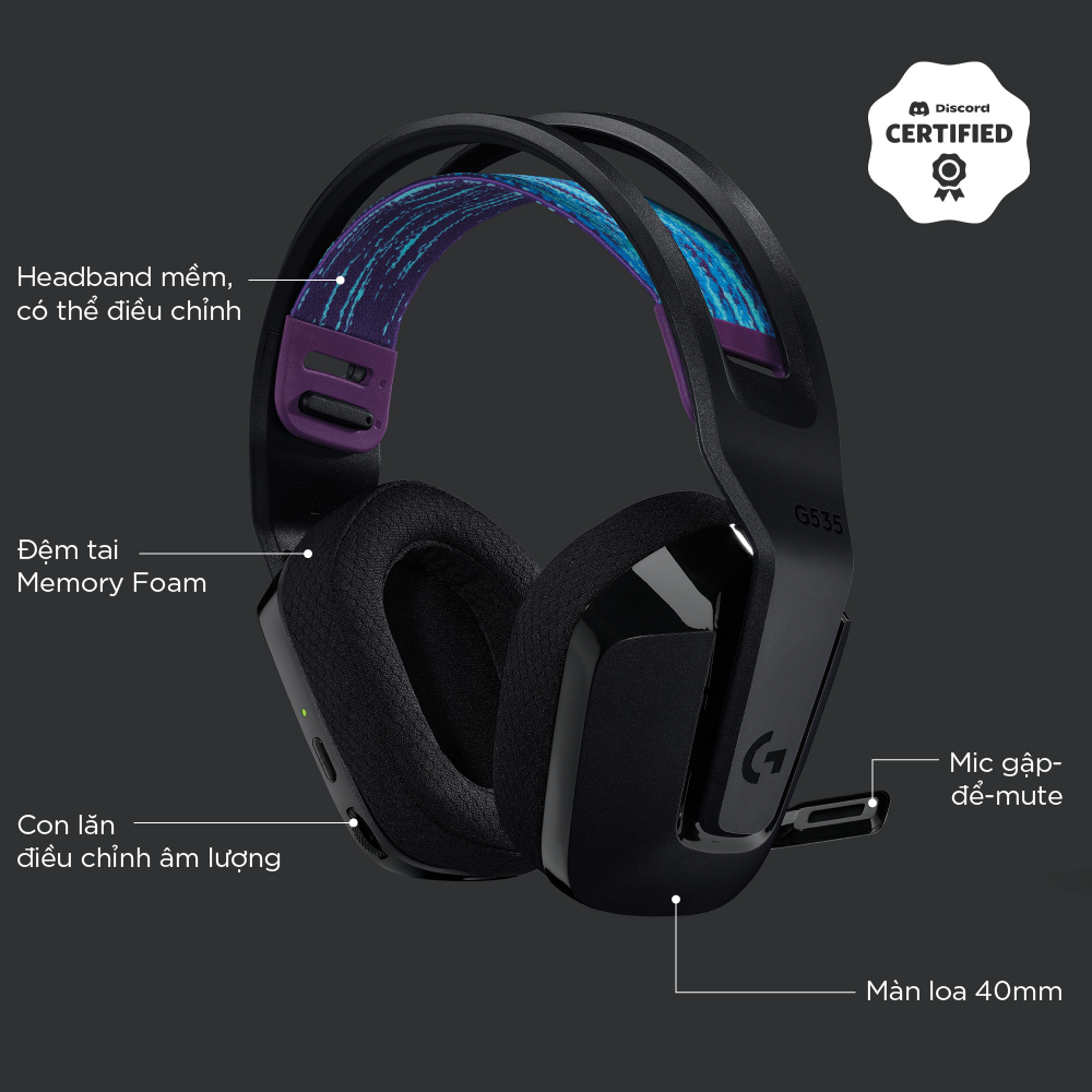 Tai nghe game không dây Lightspeed Logitech G535  - Trọng lượng nhẹ, âm thanh nổi, tương thích PC, PS4, PS5, Mic gấp để tắt tiếng Tai nghe chơi game không dây G535 đem đến cho bạn hiệu suất, sự tự do và thoải mái trong tất cả những buổi chơi game. Công nghệ LIGHTSPEED không dây tiên tiến có độ trễ thấp đem lại sự tự do không dây đáng tin cậy lên tới 12 m và thời lượng pin đáng kinh ngạc 33 giờ.(1) Màng loa 40 mm đem lại âm thanh nổi rõ ràng, trong trẻo và sâu lắng. Chỉ nặng 236 gram, quai đeo có thể điều chỉnh và chụp tai bằng cao su non mềm mại đảm bảo sự thoải mái suốt ngày. Các nút điều khiển trên tai nghe cho phép bạn nhanh chóng tăng âm lượng trò chơi hoặc âm nhạc. Chỉ cần gấp lên để tắt tiếng và giấu gọn gàng. G535 đã được chứng nhận Discord để đảm bảo đem lại hiệu suất giao tiếp rõ như pha lê với âm thanh và độ rõ ràng giọng nói tuyệt vời. - LIGHTSPEED không dây cho kết nối nâng cao, đáng tin cậy. - Thời lượng pin để chơi game là 33 giờ - Chỉ 236 gram - Thiết kế co dãn với đệm tai làm từ cao su non đem lại sự thoải mái suốt cả ngày - Điều khiển âm lượng trên tai và mic gấp-để-tắt tiếng - Màng loa 40 mm cho âm thanh nổi rõ ràng, trong trẻo - Được chứng nhận Discord cho cuộc giao tiếp rõ ràng - Hoạt động với PC và PlayStation LIGHTSPEED không dây: Công nghệ không dây LIGHTSPEED cấp độ chuyên nghiệp đem lại thời lượng pin 33 giờ (1) và sự tự do không dây đáng tin cậy lên tới 12 m Trọng lượng nhẹ và thoải mái Nặng chỉ 236 gram, G535 nhỏ và nhẹ hơn G733; quai đeo co dãn hai mặt giúp phân phối trọng lượng và có thể điều chỉnh cho độ vừa vặn tùy chỉnh Cắm vào là sử dụng được: Tối ưu hóa thời gian chơi của bạn với tai nghe chơi game dễ dùng, cắm vào là sử dụng; G535 sử dụng kết nối USB tương thích với PC và các thiết bị chơi game PlayStation Tương thích PC và máy chơi game: PlayStation 5, PlayStation 4   Điều khiển trên khung tai nghe Nút xoay âm lượng nằm trực tiếp trên khung tai nghe, để nhanh chóng tăng âm lượng trò chơi, âm nhạc hay cuộc trò chuyện của bạn; chỉ cần gấp micrô lên để tắt tiếng và cất gọn Màng loa 40 mm Với màng loa neodymium 40 mm, chiếc tai nghe chơi game không dây này đem lại âm thanh nổi rõ ràng, trong trẻo và sâu lắng, giúp cho trò chơi của bạn trở nên chân thực hơn. Thoải mái suốt ngày Chụp tai bằng cao su non thoải mái và vật liệu vải lưới thể thao lý tưởng khi sử dụng lâu dài G535 đã được chứng nhận Discord để đảm bảo đem lại hiệu suất giao tiếp rõ như pha lê với âm thanh và độ rõ ràng giọng nói tuyệt vời   YÊU CẦU HỆ THỐNG: Cổng USB cho LIGHTSPEED: Windows 10, macOS X 10.14 trở lên Kết nối Internet cho Phần mềm G HUB của Logitech (2) TRONG HỘP GỒM - Tai nghe chơi game G535 - Quai đeo mềm hai mặt (đi kèm) -