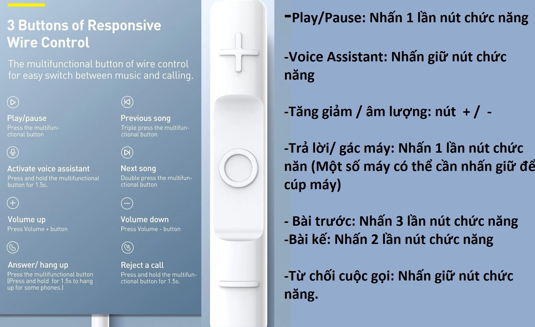 * Thương hiệu: BASEUS - Phong cách: Tai nghe - Xuất xứ: CN (Xuất xứ) - Nút điều khiển: Có - Khử ồn chủ động: Không - Giao tiếp: Có dây - Kiểm soát âm
