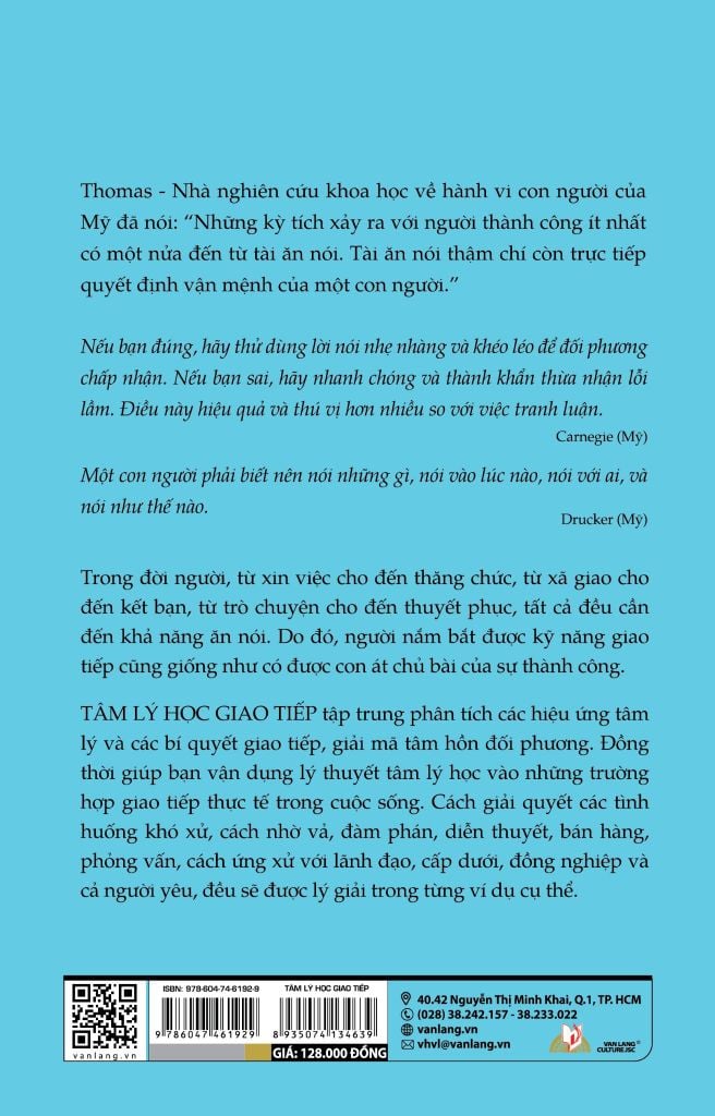 “Tâm lý học giao tiếp” tập trung phân tích các hiệu ứng tâm lý và các bí quyết giao tiếp, giải mã tâm hồn đối phương. Đồng thời giúp bạn vận dụng lý thuyết tâm lý học vào những trường hợp giao tiếp thực tế trong cuộc sống. Cách giải quyết các tình huống khó xử, cách nhờ vả, đàm phán, diễn thuyết, bán hàng, phỏng vấn, cách ứng xử với lãnh đạo, cấp dưới, đồng nghiệp và cả người yêu, đều sẽ được lý giải trong từng ví dụ cụ thể.