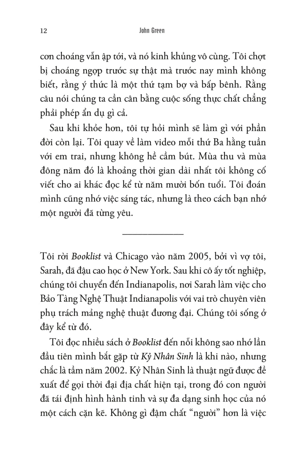 Mua tại TiktokTản Mạn Về Thế Giới - Đánh Giá Kỷ Nhân Sinh TRONG KỶ NHÂN SINH, CHẲNG CÓ KẺ ĐỨNG NGOÀI THỜ Ơ QUAN SÁT. MÀ TẤT CẢ ĐỀU CÙNG THAM GIA. Kỷ nhân sinh là thời đại địa chất hiện tại, khi con người đang định hình một cách sâu sắc diện mạo Trái Đất và sự đa dạng sinh học của nó. Thông qua tuyển tập các bài viết được chuyển thể và mở rộng từ podcast của chính mình, nhà văn ăn khách John Green đã đánh giá các khía cạnh khác nhau của Trái Đất do con người kiến tạo theo thang điểm năm sao—từ bàn phím QWERTY, khung cảnh hoàng hôn rực rỡ đến bầy ngỗng Canada và Chim cánh cụt Madagascar. Hài hước, tréo ngoe và giàu hình ảnh, các bài viết đã phác họa nên những nghịch lý của nhân loại đương đại. Sở hữu nguồn sức mạnh to lớn, nhưng con người cũng thật mềm yếu; nghịch lý càng trở nên rõ nét hơn khi loài người phải đối mặt với đại dịch toàn cầu vừa chia cắt lại cũng vừa gắn kết chúng ta với nhau. Các bài viết trong "Đánh giá kỷ nhân sinh" một lần nữa cho thấy tài kể chuyện hiếm có của John Green. Tác phẩm là cuộc hành trình khám phá đầy cảm hứng về những con đường mà chúng ta đã khai mở, đồng thời là một lời tụng ca chân thành về tình yêu dành cho thế giới.
