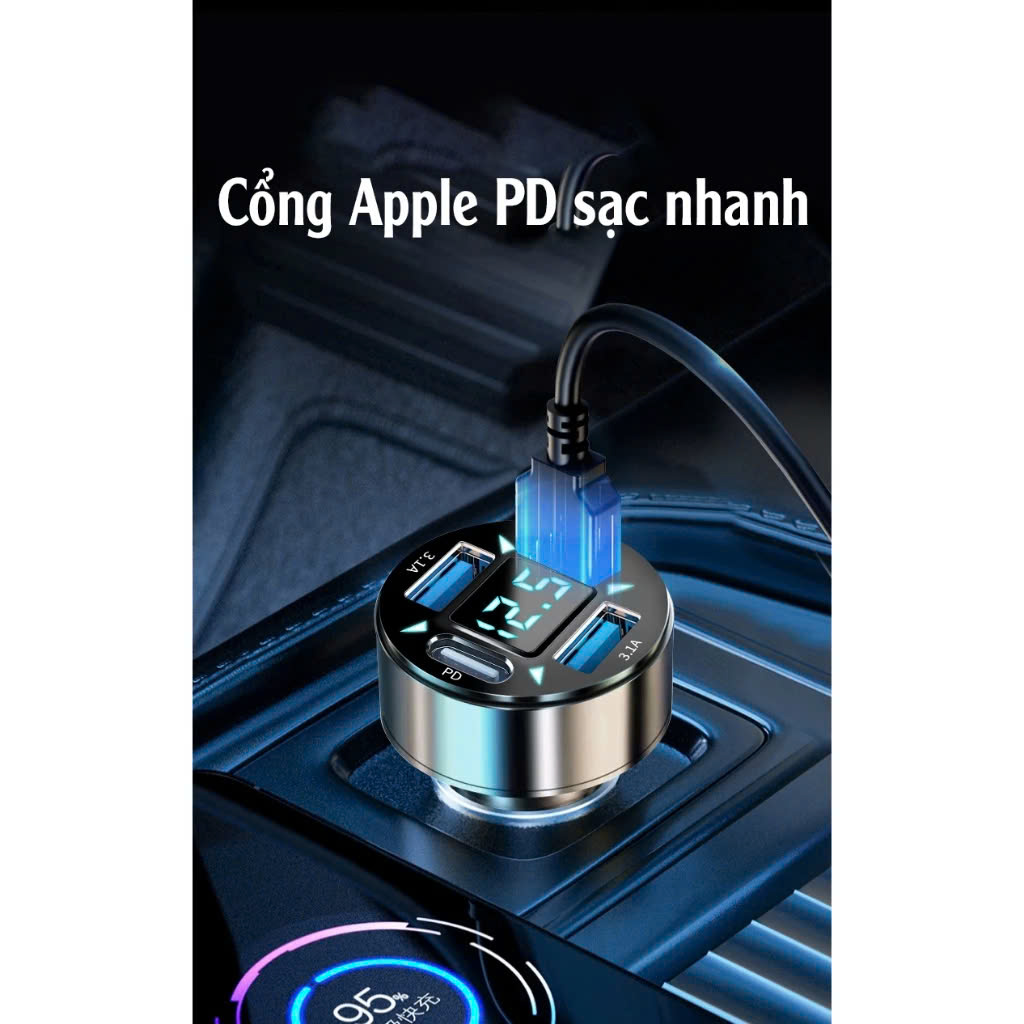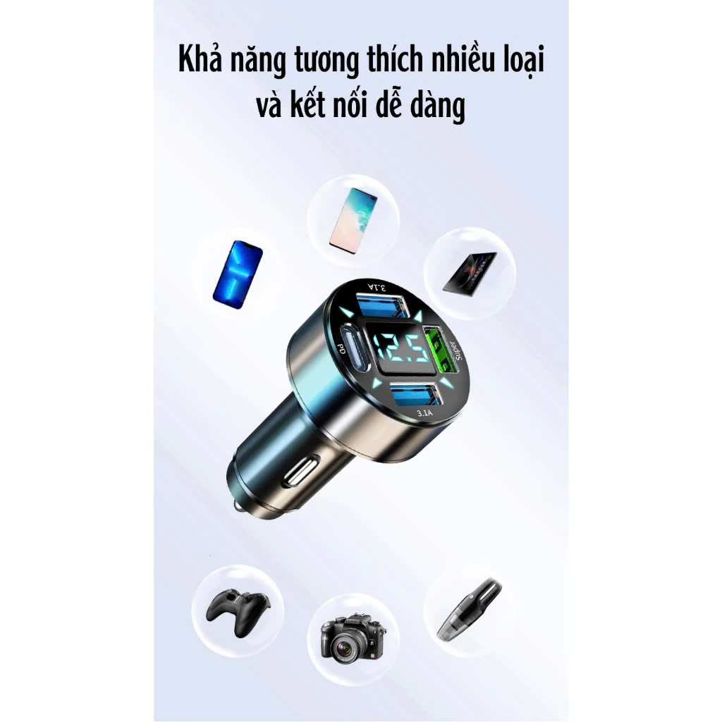 Tẩu Sạc Nhanh Xe Ô Tô TÍCH HỢP DÂY Sạc Type C, Lightning 100W | Hiển Thị Thông Số Sạc, Dây Rút Chống Rối, 4in1 Thuận tiện: Bộ sạc ô tô USB này có thiết
