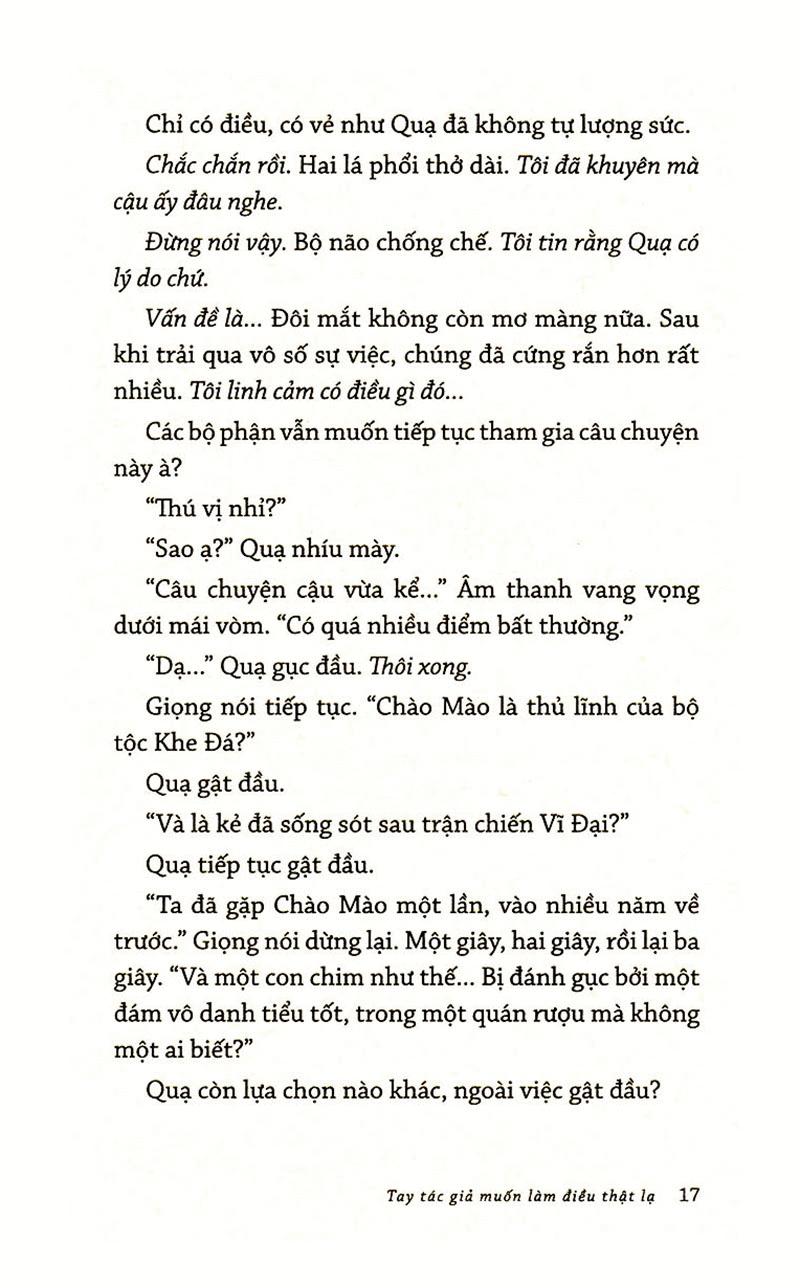 Trong quyển 2 này - Tay Tác Giả Muốn Làm Điều Lạ - hành trình của Quạ có thêm những người bạn mới và sự khốc liệt tăng dần lên đến đỉnh điểm. Bạn đọc vừa theo dõi câu chuyện vừa khám phá cách thức xây dựng cấu trúc bài thuyết trình bằng cả ngôn ngữ nói lẫn viết để cuối cùng có thể thuyết phục được người nghe xoay chuyển ý muốn của họ theo một chiều hướng khác.