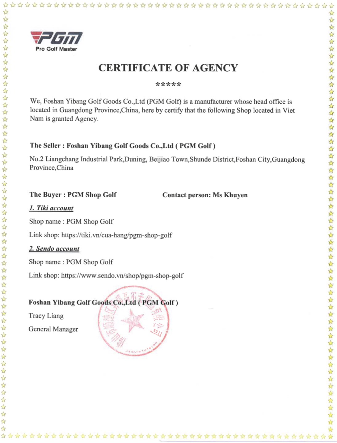 PGM Shop Golf rất vinh dự được Tổng quản lý Ms.Tracy Liang đại diện cho công ty Foshan Yibang Golf Goods Co.,Ltd (PGM Golf) tại Trung Quốc cấp chứng nhận Đại lý bán hàng chính hãng PGM tại Việt Nam. PGM Shop Golf luôn hướng tới mục tiêu mang những sản phẩm chất lượng tốt nhất với giá thành hợp lý nhất tới khách hàng.