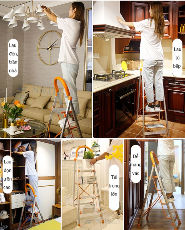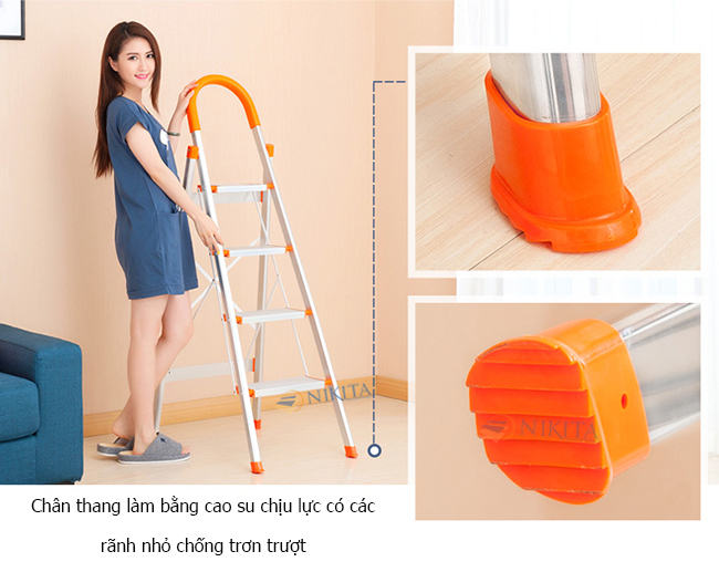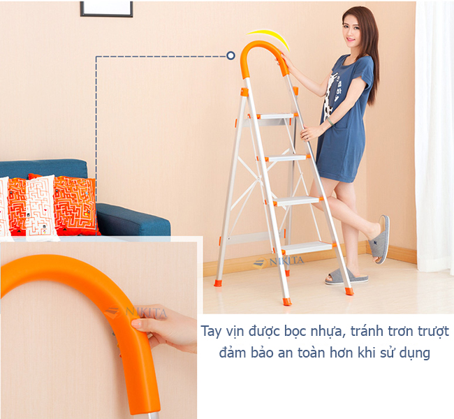 CHI TIẾT SẢN PHẨM CHI TIẾT SẢN PHẨM: Chiều cao sử dụng: 1.2 m Kích thước gấp gọn: 1.7 x 0.47 x 0.18 m Trọng lượng : 4 kg Số bậc : 06 bậc Kích thước bậc trên cùng: 13 x 24 cm Chất liệu : INOX Màu sắc : Trắng + Cam Tải trọng 150kg, tiêu chuẩn EN131 Thang tay vịn INOX được sản xuất theo mẫu Châu Âu  tiêu chuẩn EN 131, phần tay vịn được bọc nhựa tránh trơn trượt, đảm bảo an toàn khi sử dụng                                                   • CHÂN THANG: làm bằng cao su chịu lực có các rãnh nhỏ chống trơn trượt                             Bậc thang rộng và khoảng cách giữa các bậc rất ngắn giúp người leo lên xuống an toàn và thoải mái.                                 Thang tay vịn Inox Nikita có độ bền chắc chắn, tải trọng cao, đặc biệt rất thích hợp cho phụ nữ và người cao tuổi.                                 Thang được thiết kế với mẫu mã đẹp, rất tiện lợi cho gia đình, dễ dàng cất gọn sau cánh cửa, sau tủ hay gầm giường…                      Thang Inox tay vịn thích hợp sử dụng cho phụ nữ, dùng làm vườn, lấy hồ sơ, thay bóng đèn, lau cửa kính…