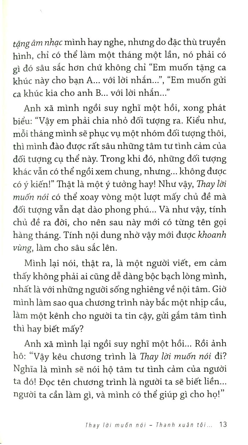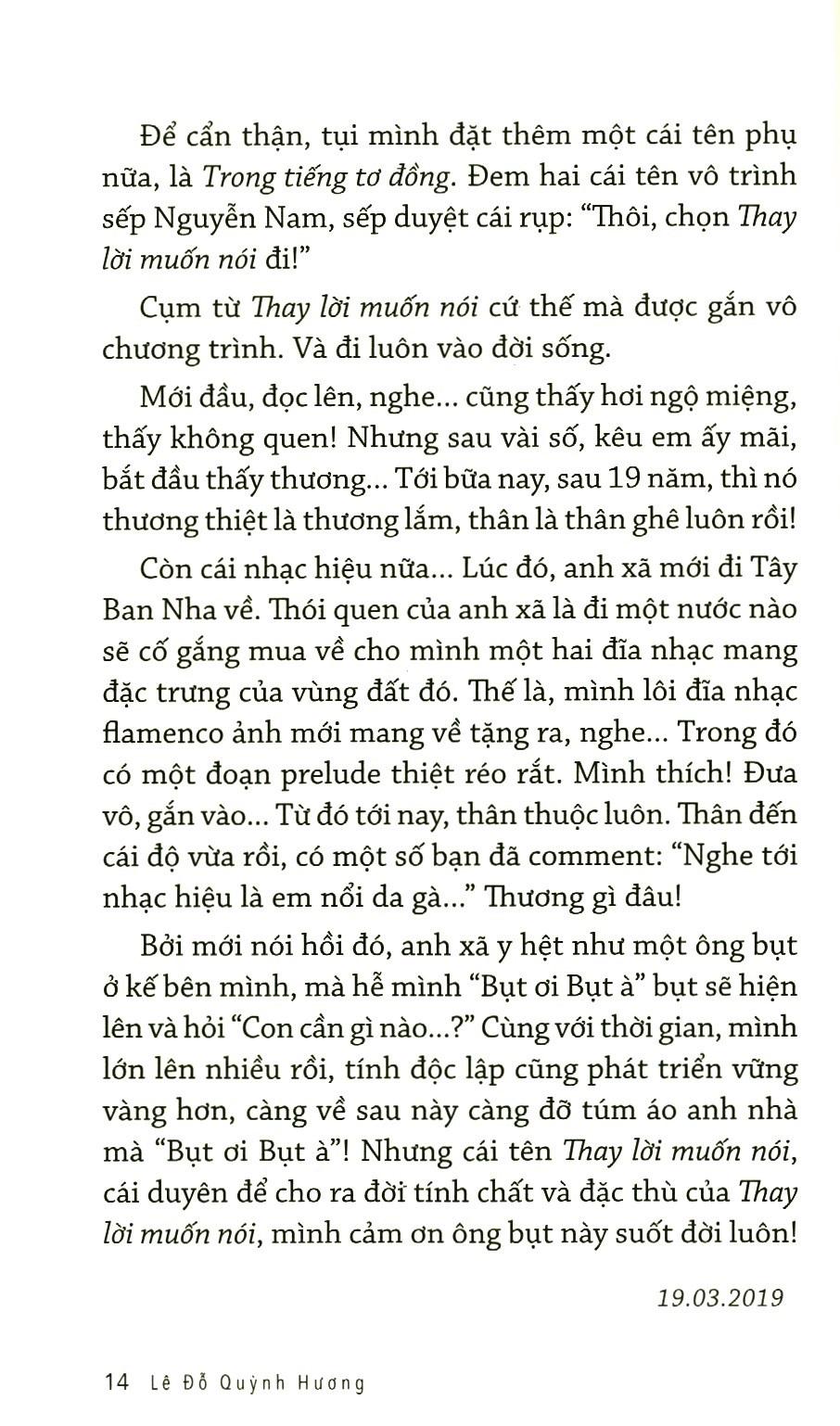 Quyển sách là tập tùy bút của tác giả tổng hợp những tản mạn đi cùng 19 năm gắn bó chương trình Thay lời muốn nói của HTV.