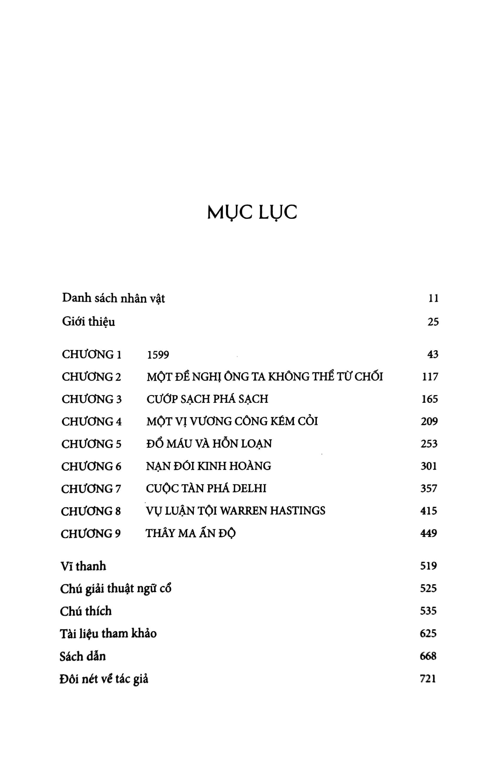 Đế chế Đông Ấn Anh – Một lịch sử của giao thương, quyền lực và sự tham tàn kể lại câu chuyện lịch sử ấn tượng bậc nhất: bằng cách nào mà Đế chế Mughal – vốn đã thống trị nền thương mại và sản xuất thế giới, nắm trong tay nguồn lực gần như vô hạn – lại tan tành và bị thay thế bởi một tập đoàn đa quốc gia cách nơi đó hàng nghìn dặm, bên kia biển lớn, một tập đoàn chỉ chịu trách nhiệm với các cổ đông, hầu hết chưa từng nhìn thấy Ấn Độ và chẳng hề biết gì về đất nước mà của cải từ đó đã trả cổ tức cho họ. Sử dụng các nguồn tư liệu trước kia chưa có ai tìm hiểu, Dalrymple kể câu chuyện về Công ty Đông Ấn theo cách chưa từng thấy và vẽ ra chân dung những hệ quả tai hại của việc lạm dụng quyền lực doanh nghiệp.
