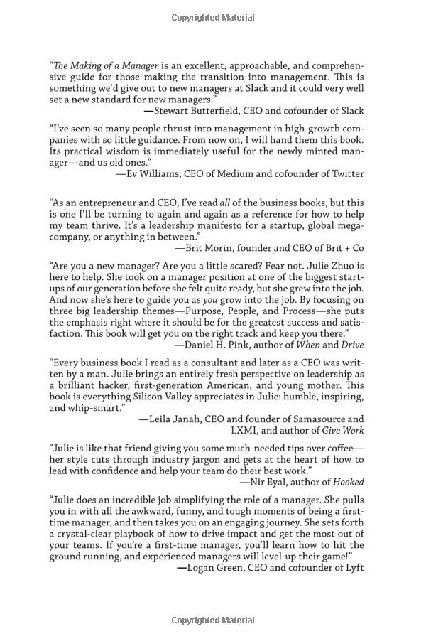 Now, having managed dozens of teams spanning tens to hundreds of people, Julie knows the most important lesson of all: great managers are made, not born. If you care enough to be reading this, then you care enough to be a great manager.