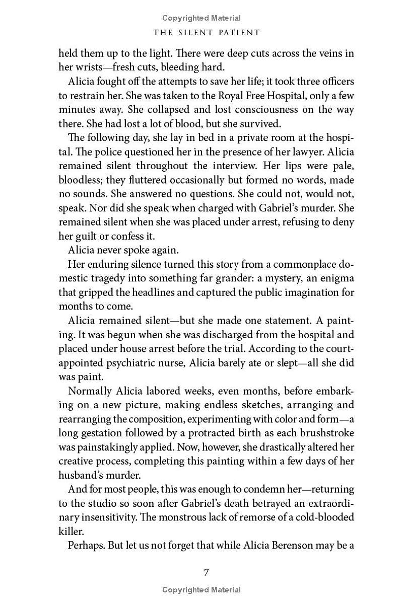 Theo Faber is a criminal psychotherapist who has waited a long time for the opportunity to work with Alicia. His determination to get her to talk and unravel the mystery of why she shot her husband takes him down a twisting path into his own motivations―a search for the truth that threatens to consume