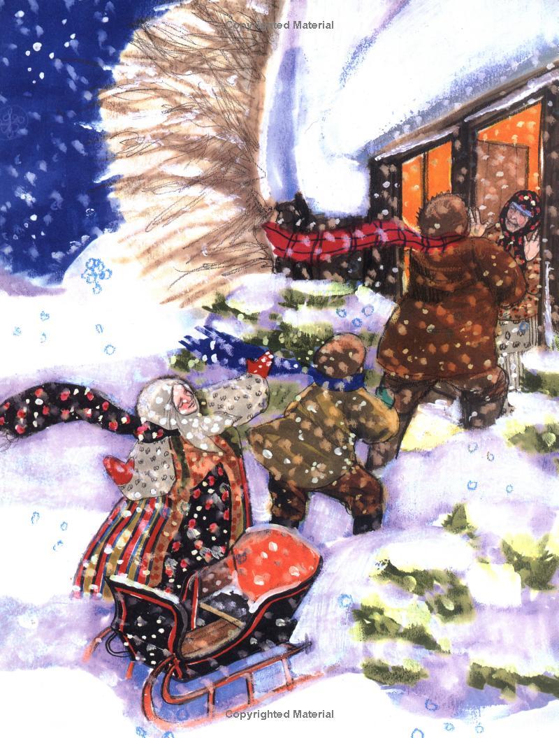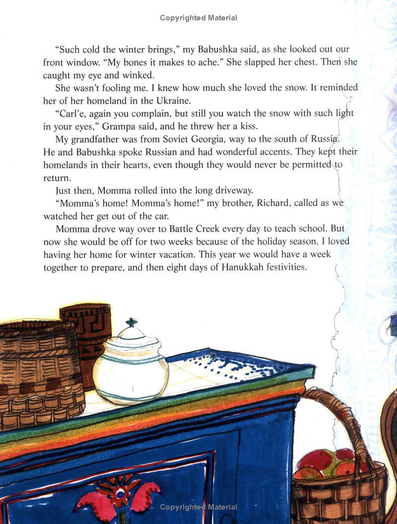 Trisha loves the eight days of Hanukkah, when her mother stays home from work, her Babushka makes delicious potato latkes, and her Grampa carves wonderful animals out of wood as gifts for Trisha and her brother. In the middle of her family's preparation for the festival of lights, Trisha visits her closest neighbors, expecting to find them decorating their house for Christmas. Instead they are all bedridden with scarlet fever. Trisha's family is one of the few who has been spared from the epidemic. It is difficult for them to enjoy their Hanukkah feast when they know that their neighbors won't be able to celebrate their holiday. Then Grampa has an inspiration: they will cut down trees, decorate them, and secretly deliver them to the neighbors, "But what can we decorate them with?" Babushka asks. Although it is a sacrifice, Trisha realizes that Grampa's carved animals are the perfect answer. Soon her living room is filled with trees -- but that is only the first miracle of many during an incredible holiday season.