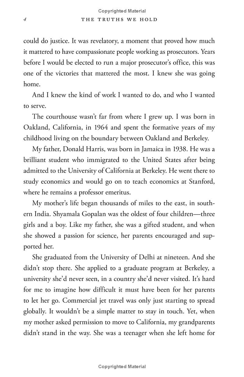 Vice President Kamala Harris's commitment to speaking truth is informed by her upbringing. The daughter of immigrants, she was raised in an Oakland, California community that cared deeply about social justice; her parents--an esteemed economist from Jamaica and an admired cancer researcher from India--met as activists in the civil rights movement when they were graduate students at Berkeley. Growing up, Harris herself never hid her passion for justice, and when she became a prosecutor out of law school, a deputy district attorney, she quickly established herself as one of the most innovative change agents in American law enforcement. She progressed rapidly to become the elected District Attorney for San Francisco, and then the chief law enforcement officer of the state of California as a whole. Known for bringing a voice to the voiceless, she took on the big banks during the foreclosure crisis, winning a historic settlement for California's working families. Her hallmarks were applying a holistic, data-driven approach to many of California's thorniest issues, always eschewing stale "tough on crime" rhetoric as presenting a series of false choices. Neither "tough" nor "soft" but smart on crime became her mantra. Being smart means learning the truths that can make us better as a community, and supporting those truths with all our might. That has been the pole star that guided Harris to a transformational career as the top law enforcement official in California, and it is guiding her now as a transformational United States Senator, grappling with an array of complex issues that affect her state, our country, and the world, from health care and the new economy to immigration, national security, the opioid crisis, and accelerating inequality.