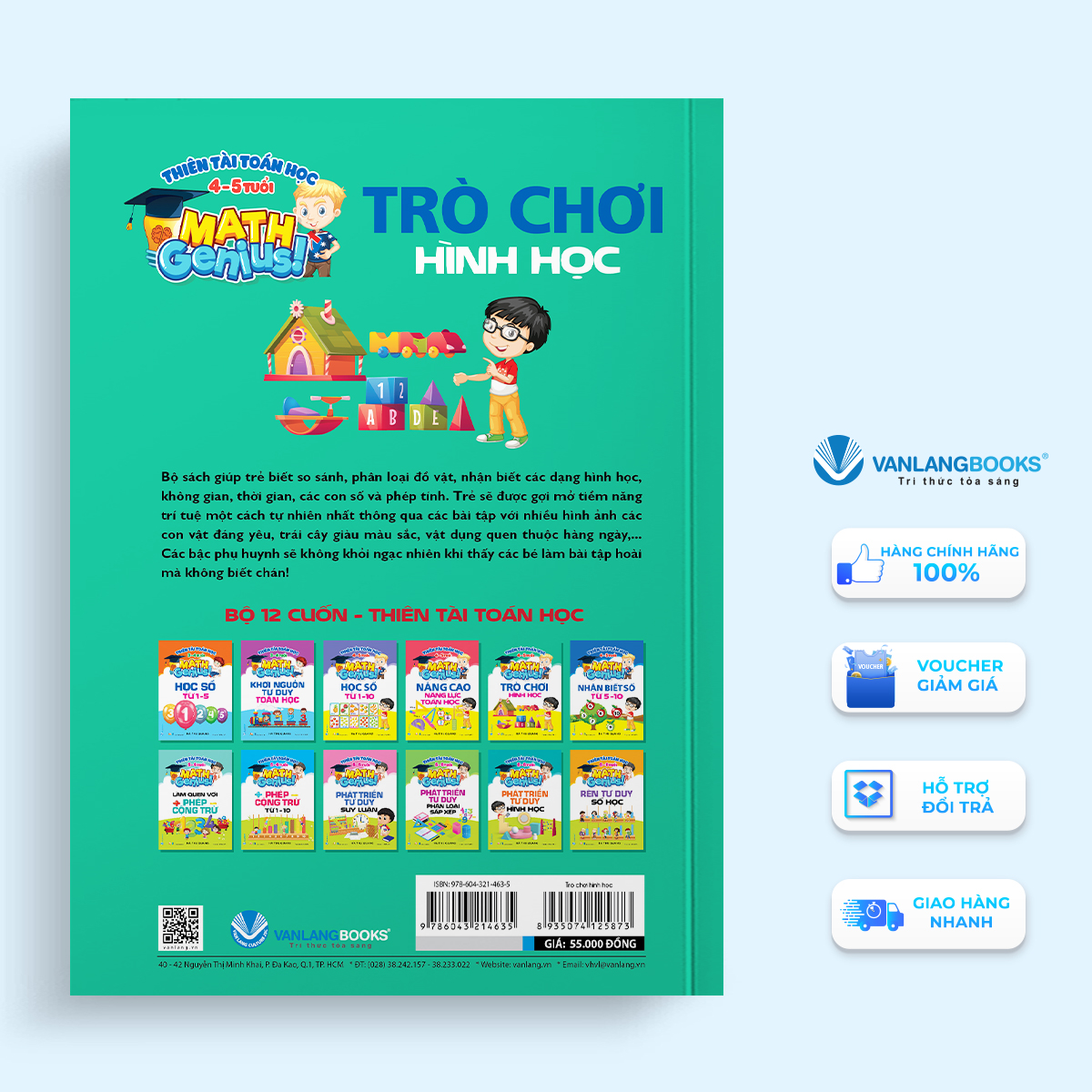 Thiên Tài Toán Học (4 - 5 Tuổi) - Trò Chơi Hình Học - VanlangbooksGiới thiệuBộ sách giúp trẻ biết so sánh, phân loại đồ vật, nhận biết các dạng hình học, không gian, thời gian, các con số và phép ...