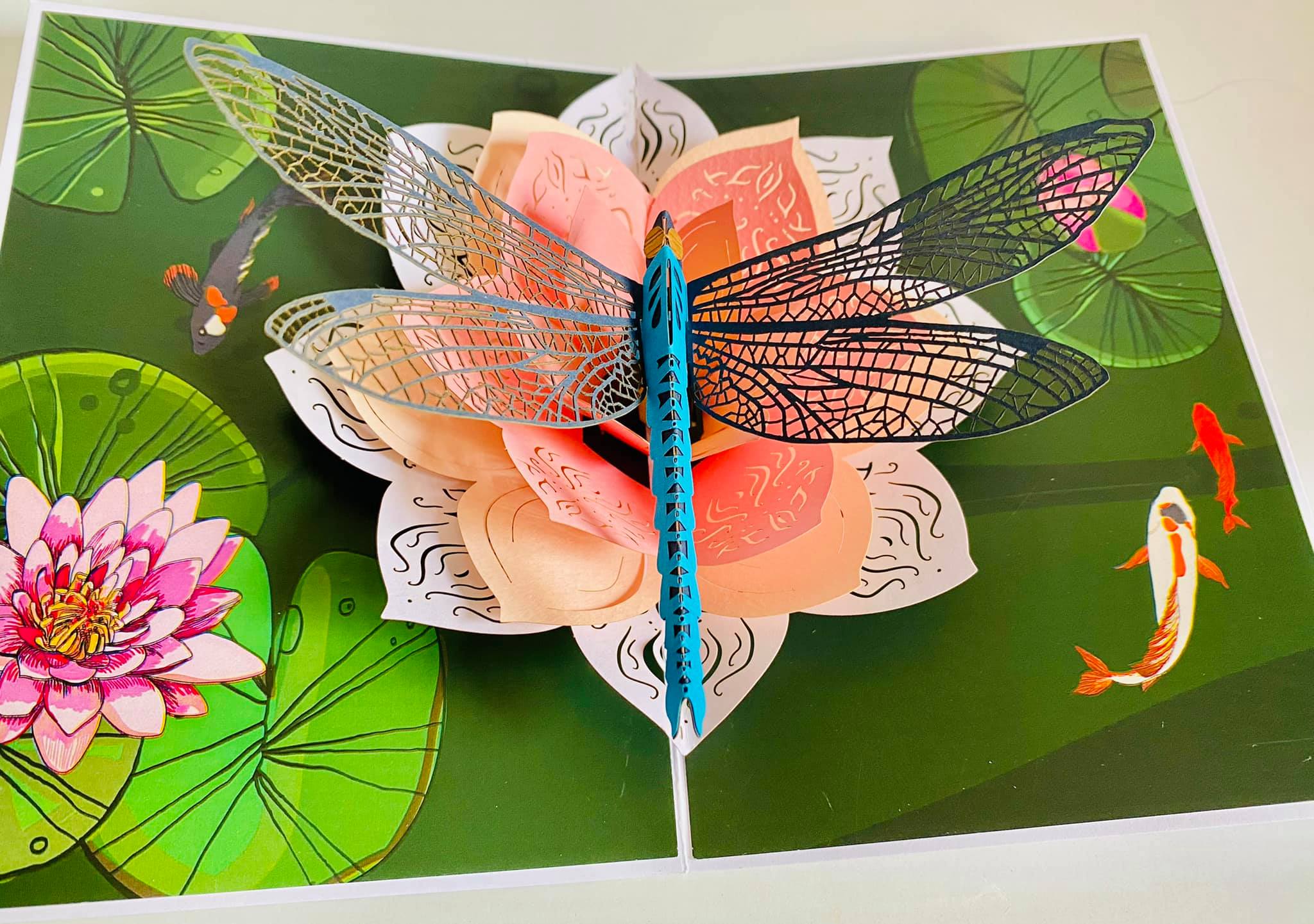 ✨Thiệp 3D Pop Up Chuồn Chuồn & Hoa Sen – Thiệp Nghệ Thuật, Thiệp Chúc Mừng, Sinh Nhật, Độc Đáo, F21